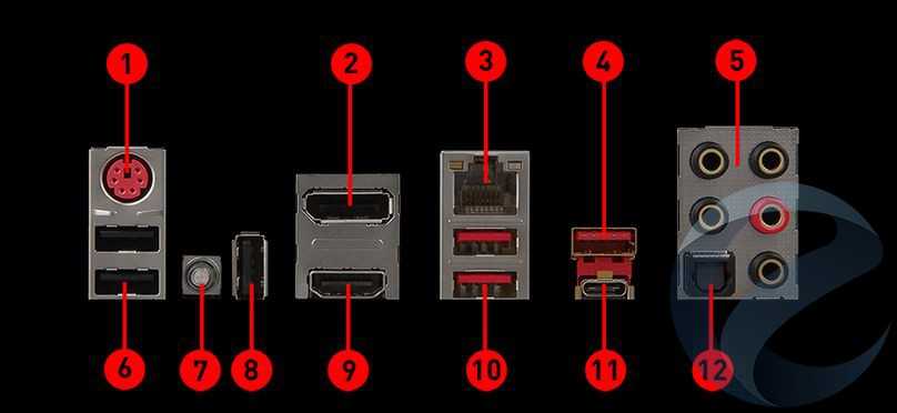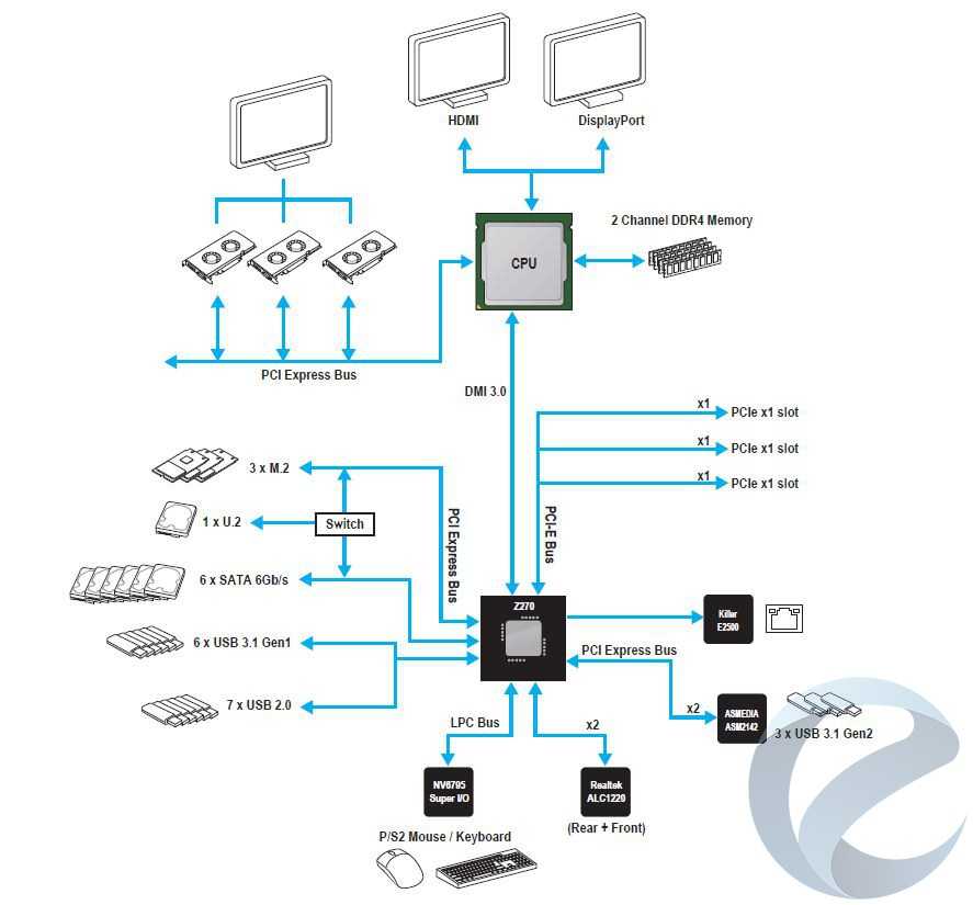 - Порты USB: чипсет Intel Z270 – 6 × USB 3.1 Gen1 (5 Гбит/сек), 7 × USB 2, чипсет ASMedia: 2 × USB 3.1 Gen 2 Type-C, 1 × USB 3.1 Gen 2 Type-A (10 Гбит/сек);