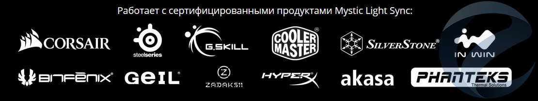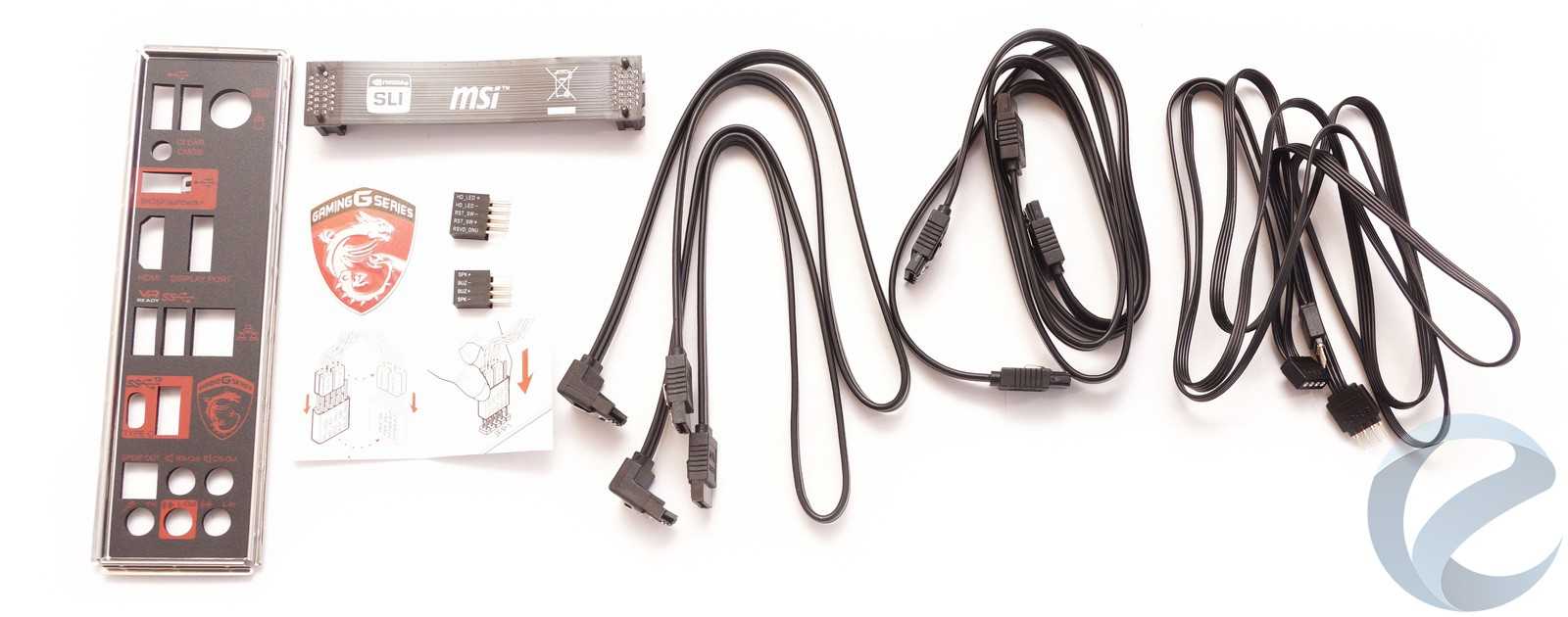 В комплекте имеется четыре SATA кабеля, два из которых — с угловыми разъемами, кабель-разветвитель для подключения двух RGB лент, мостик SLI, значок-наклейка с драконом. Кроме того есть заглушка на интерфейсную панель с маркировкой портов и две колодки для облегчения подключения кабелей с фронтальной панели.