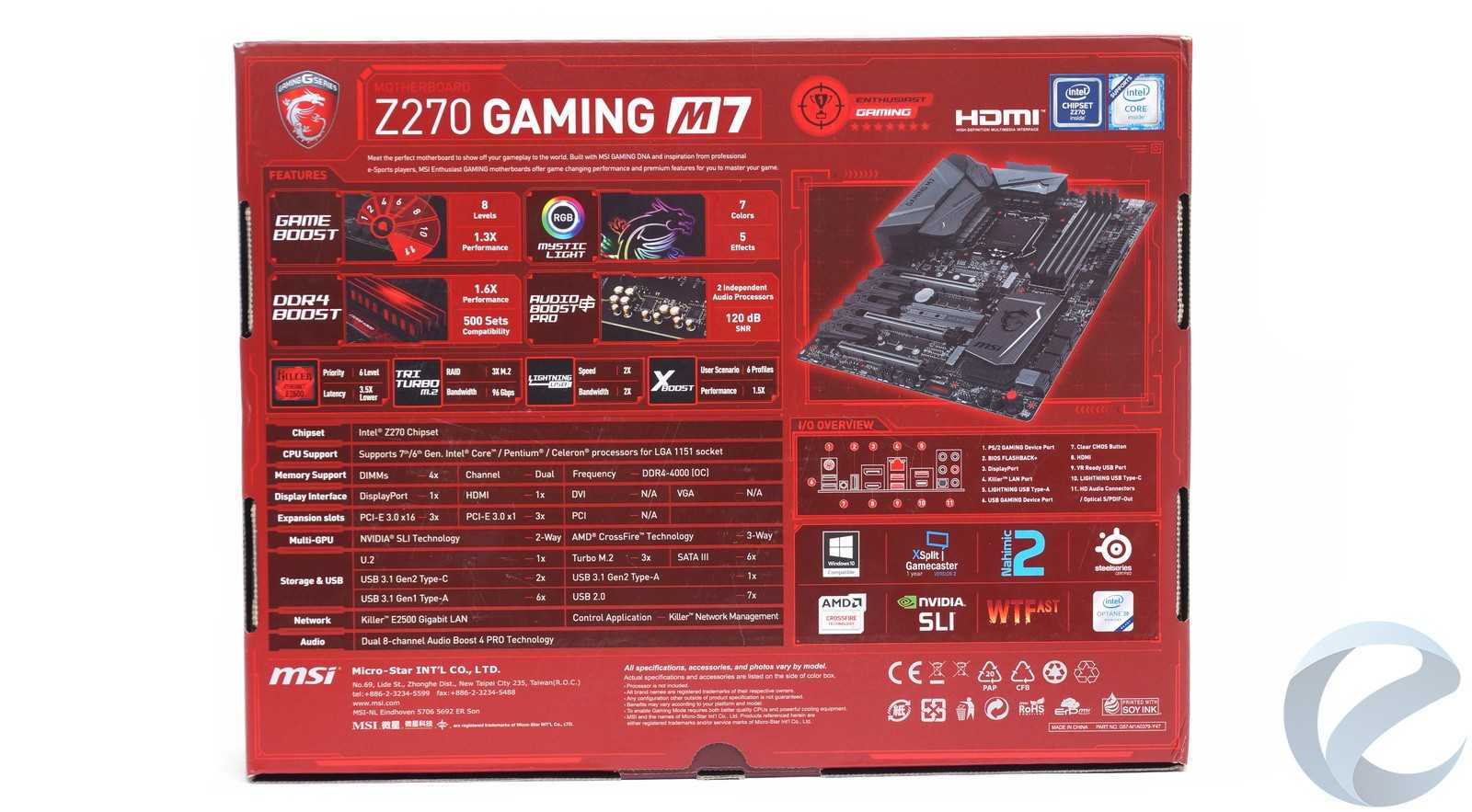 Материнская плата MSI Z270 GAMING M7 заслуженно относится к топовым решениям для энтузиастов и геймеров. Реализованы все возможности чипсета intel Z270 и даже сверх того, за счет стороннего контроллера ASMedia добавлены еще 3 порта USB. Но, к сожалению, использовать некоторые интерфейсы одновременно невозможно, они делят между собой пропускную способность линий.