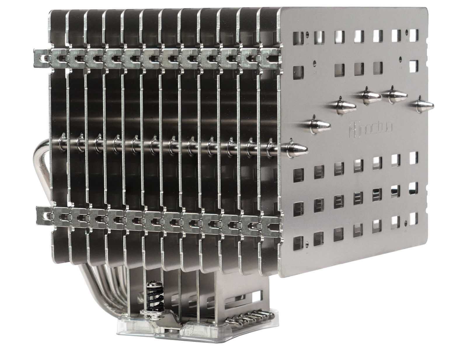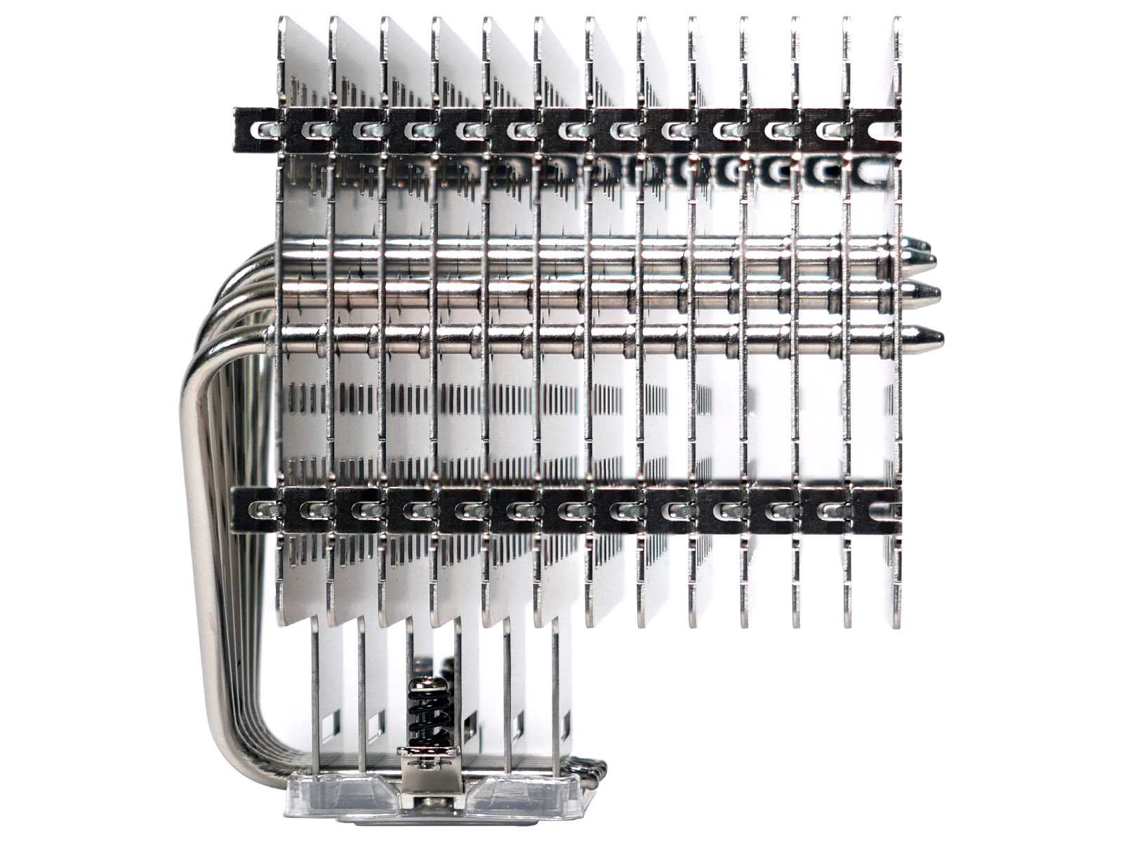 Трубки расположены так, чтобы тринадцать пластин были смещены вбок. Такая конструкция не препятствует установке высоких планок ОЗУ и видеокарт для большинства актуальных материнских плат.