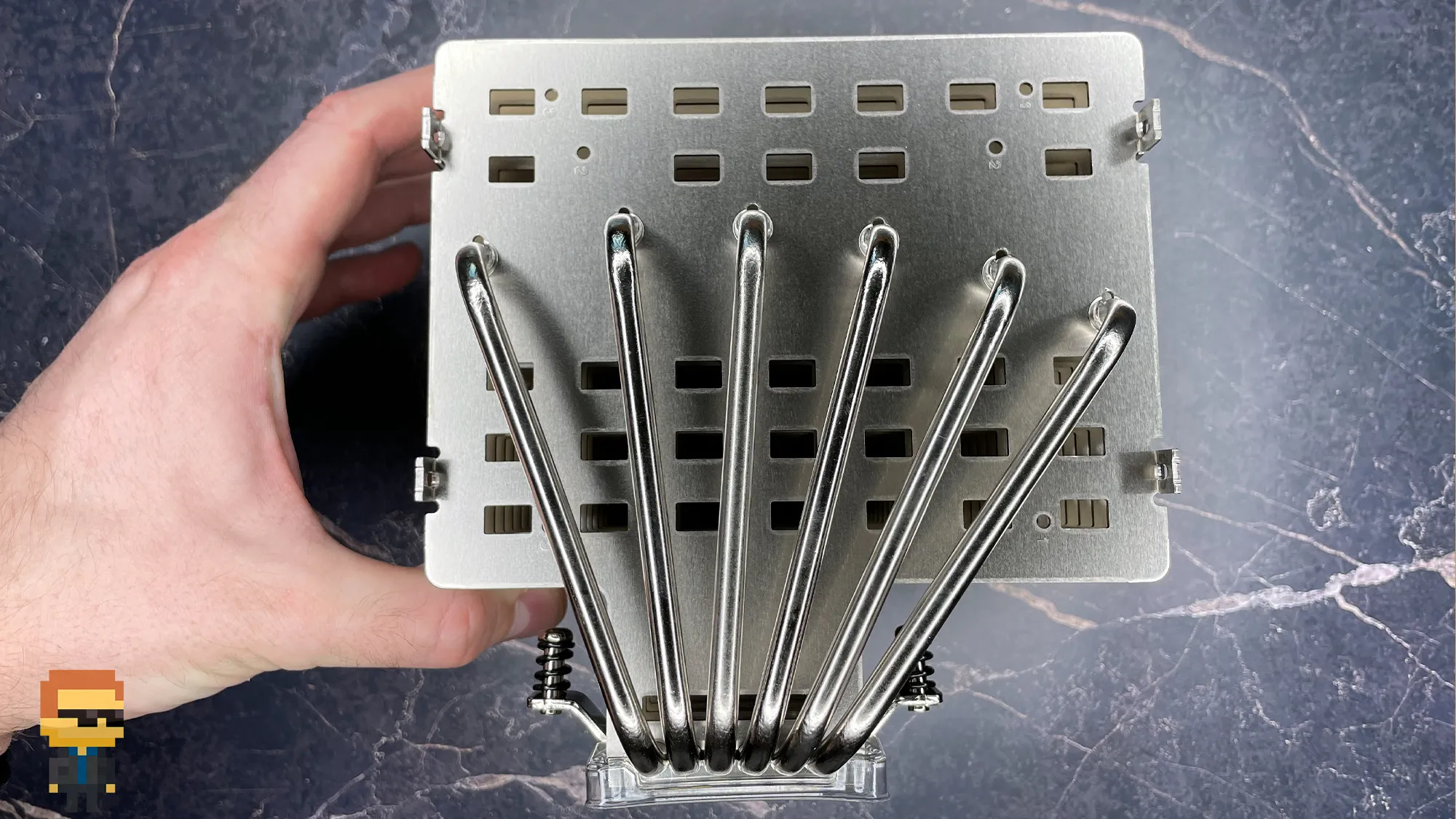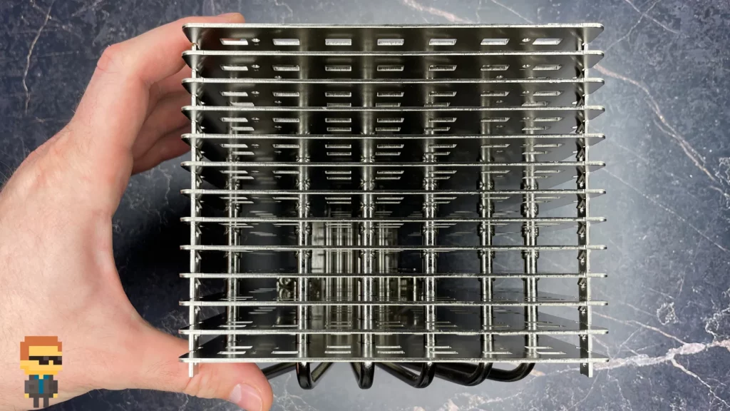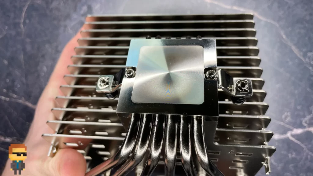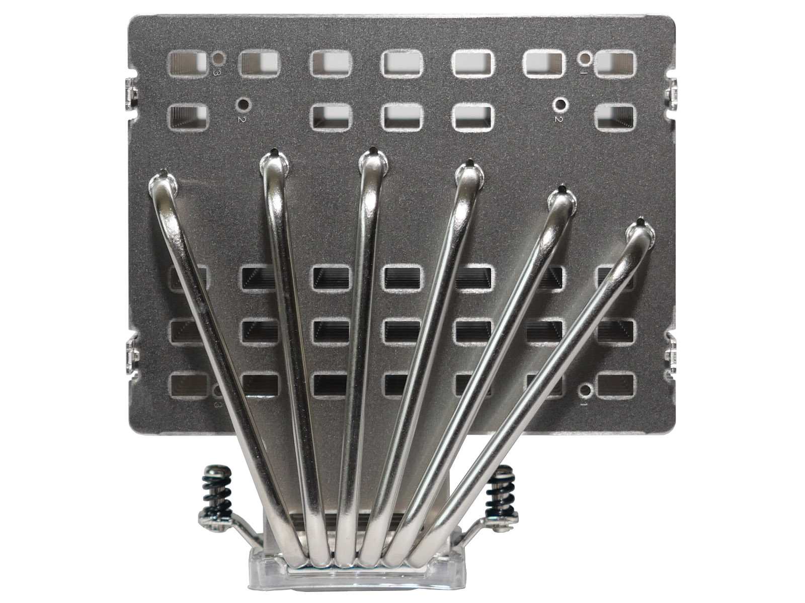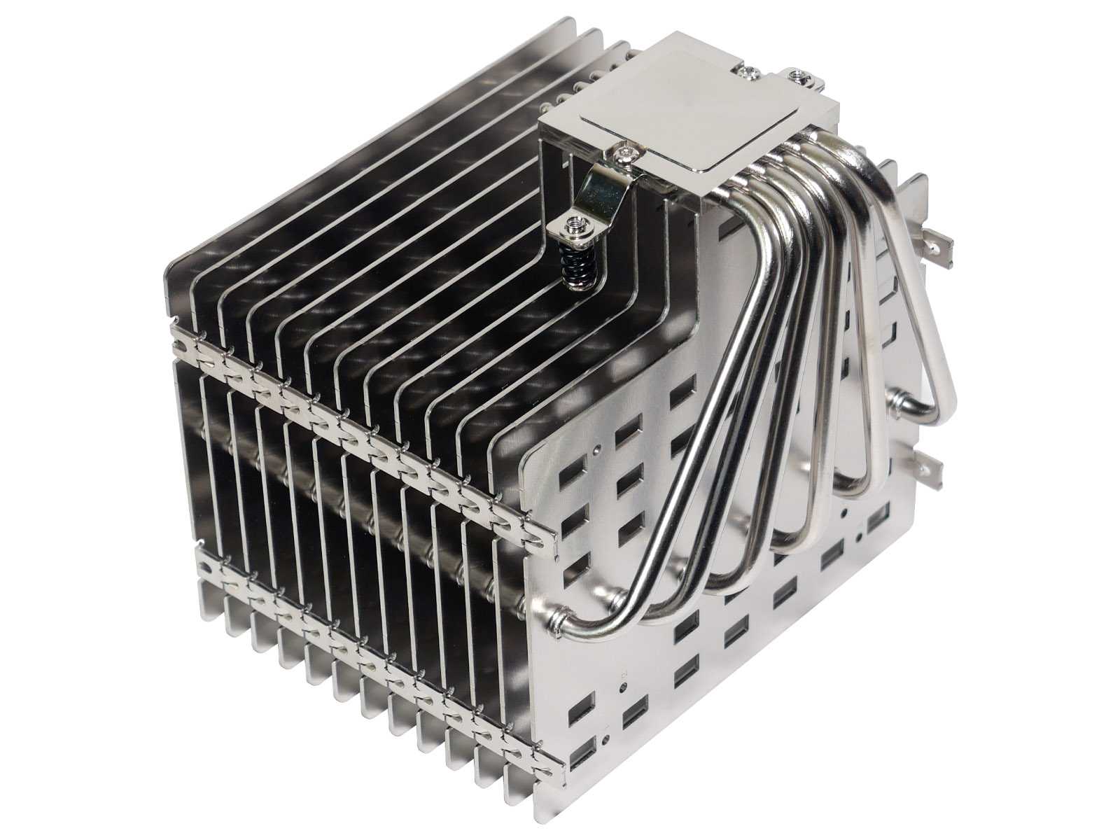 Система охлаждения содержит шесть мощных тепловых трубок. Диаметр каждого — 6 мм. Исходят от основания кулера и веером расходятся в стороны, проходят сквозь ребра радиатора. Качество и аккуратность пайки в местах соприкосновения трубок с пластинами высокое.