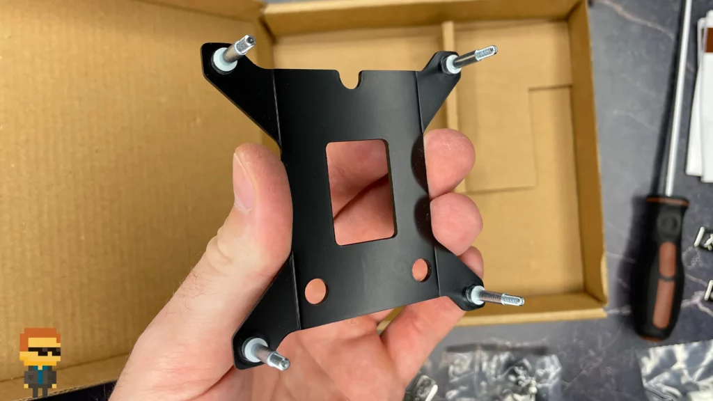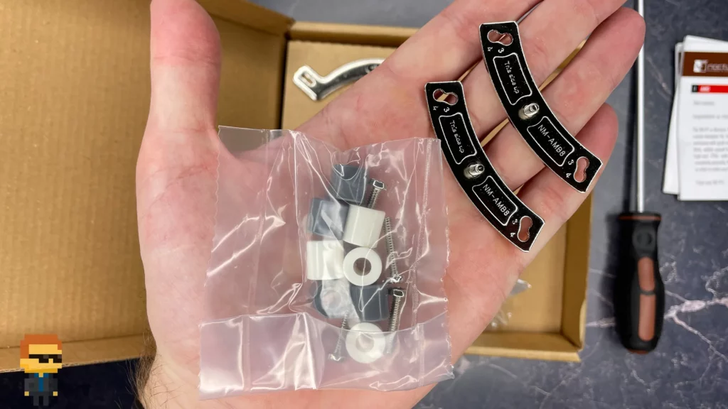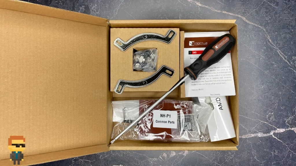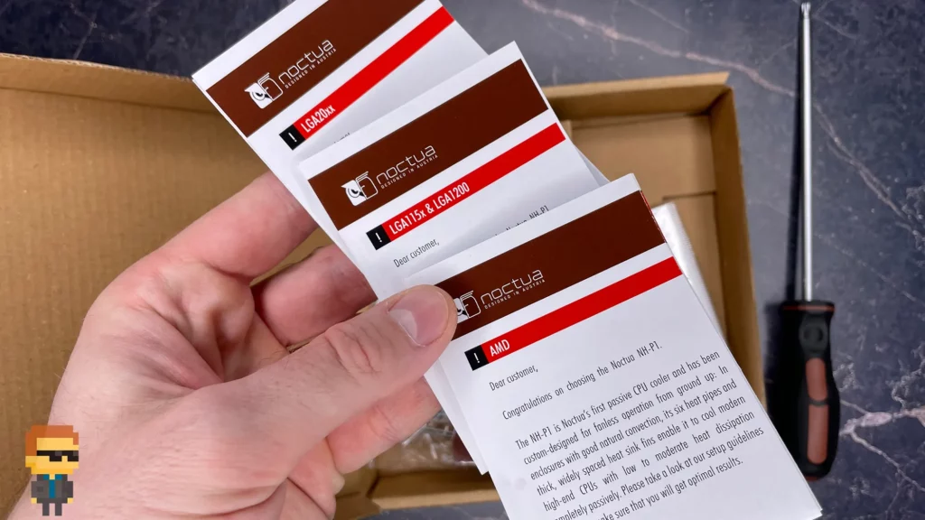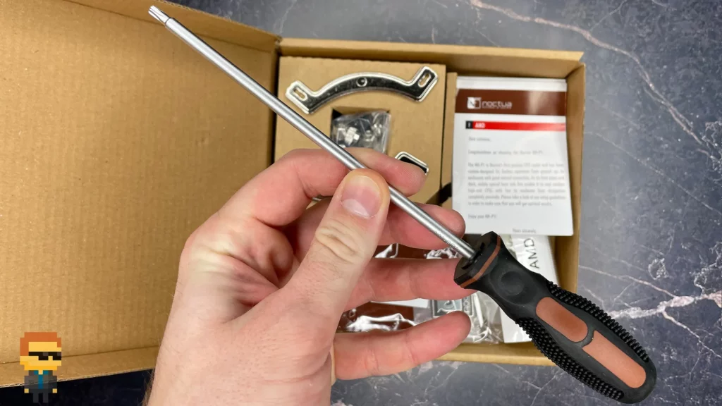 Рисунки на верхней коробке не оставляют сомнений в ее содержимом. Премиальная отвертка с удобной ручкой — мечта продвинутого сборщика. Длина достаточна для того, чтобы дотянуться до крепления через зазор между ребрами радиатора.