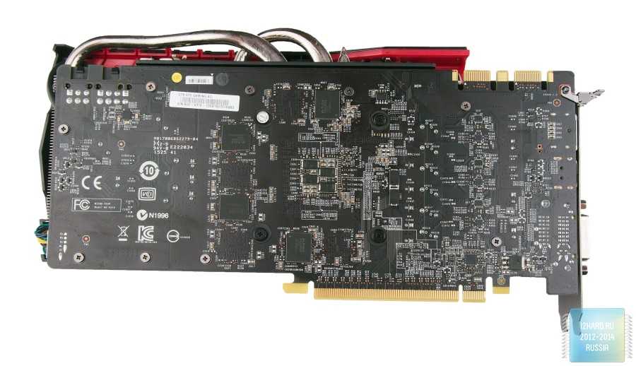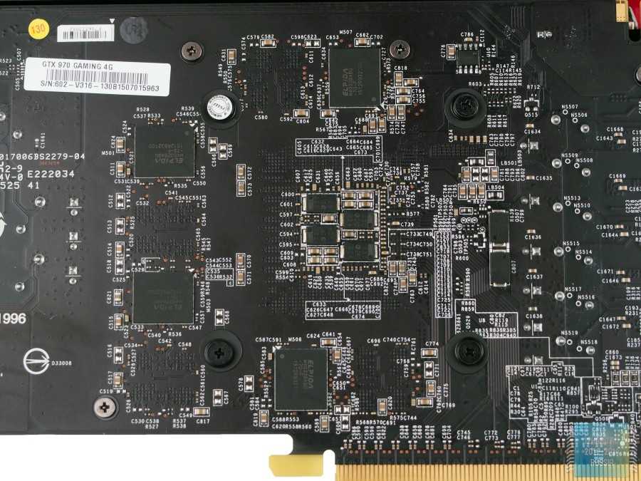 Тыльная сторона видеокарты MSI GeForce GTX 970 Gaming 4G не имеет никакой укрепляющей металлической пластины снаружи, и элементы платы доступны для детального осмотра.