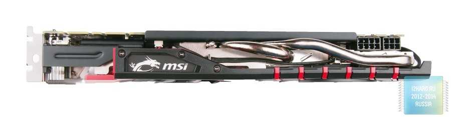 Несмотря на массивную систему охлаждения, видеокарта MSI GeForce GTX 970 Gaming 4G при установке в корпус системного блока занимает всего два слота. Во многом это заслуга новой системы охлаждения, в которой производитель сделал несколько малозаметных, но важных инженерных решения. В первую очередь кожух системы охлаждения MSI GeForce GTX 970 Gaming 4G несколько утоплен за металлическую заднюю планку разъемов, и во вторую очередь здесь применены низкопрофильные вентиляторы с диаметром крыльчатки 100 мм. Эти, казалось бы, маловажные решения позволили сделать MSI GeForce GTX 970 Gaming 4G более компактной по толщине, что может дать возможность устанавливать две таких видеокарты в соседние PCI-E x16 слоты расширения.