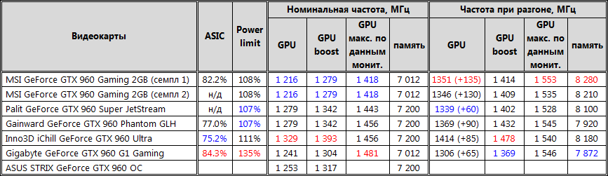 Поскольку к сегодняшнему дню мы протестировали уже шесть оригинальных моделей GeForce GTX 960, то попробуем подвести промежуточный итог их разгона. Для этого мы свели в таблицу ASIC-качество графических процессоров этих видеокарт, значение Power Limit, их номинальные частоты (включая фактические по данным мониторинга), а также полученные частоты при разгоне. Лучшие результаты выделены красным, худшие — синим, а видеокарты расположены в таблице в хронологическом порядке их тестирования. ASUS STRIX GeForce GTX 960 OC включена в таблицу авансом, поскольку мы всё ещё ждём эту модель на тесты.