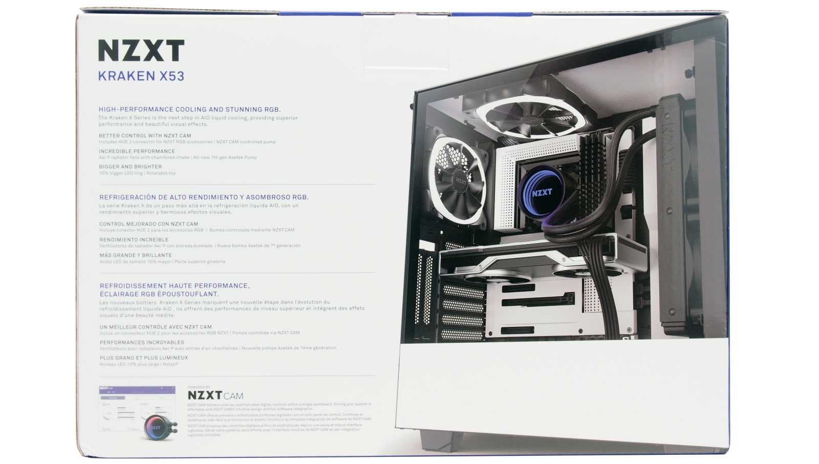 Зато более подробная информация о Kraken X53 представлена на тыльной стороне упаковки. Здесь даже показано, как данная СЖО будет выглядеть в системе с материнской платой этого же производителя.
