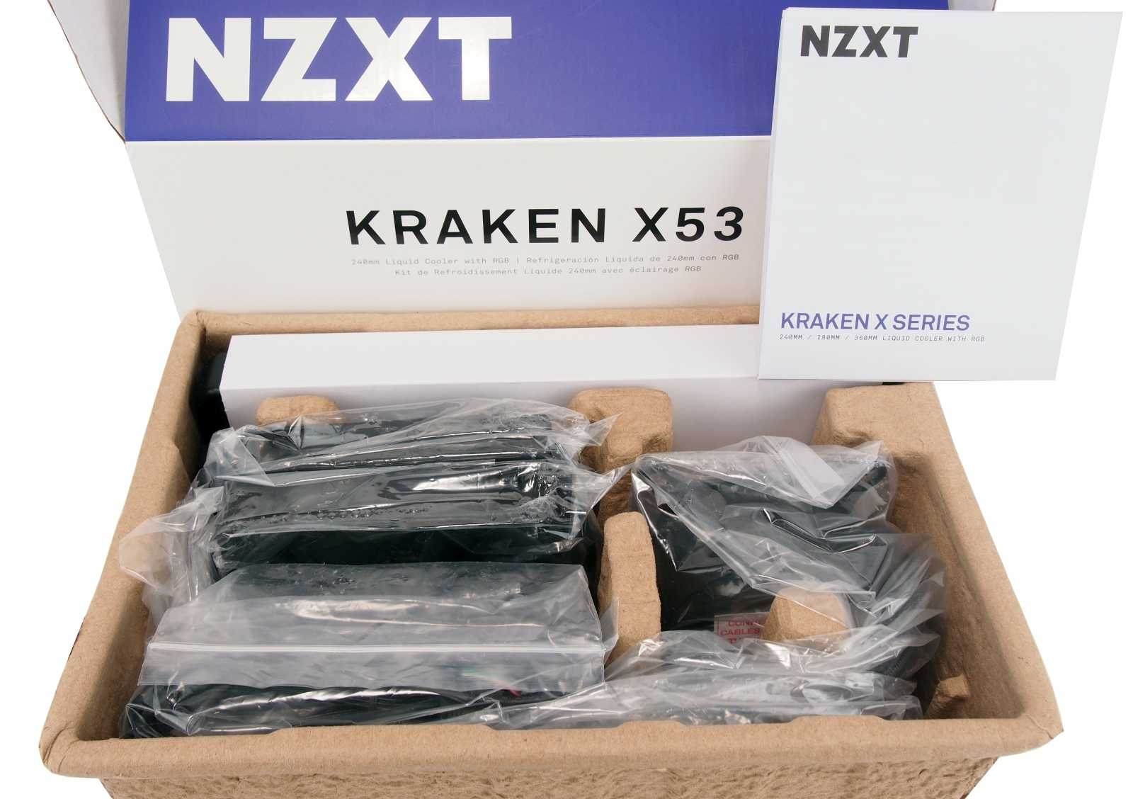 Производитель позаботился о сохранности водянки Kraken X53 и комплекта поставки на время транспортировки. Все компоненты уложены в картонную ванну с отсеками, отделенными перегородками.