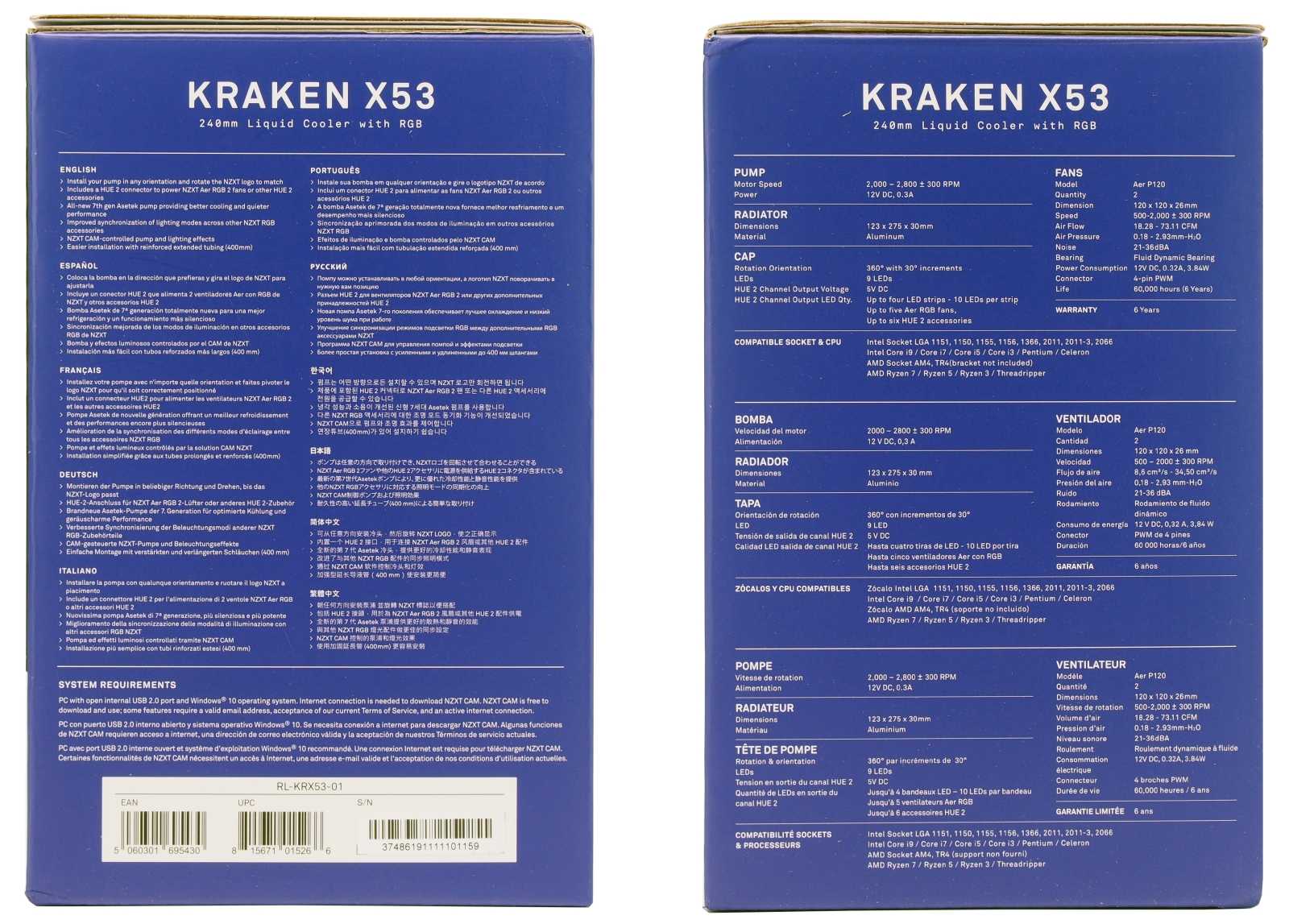 Что касается технической информации о Kraken X53, то ею заполнены обе торцевые грани упаковки.