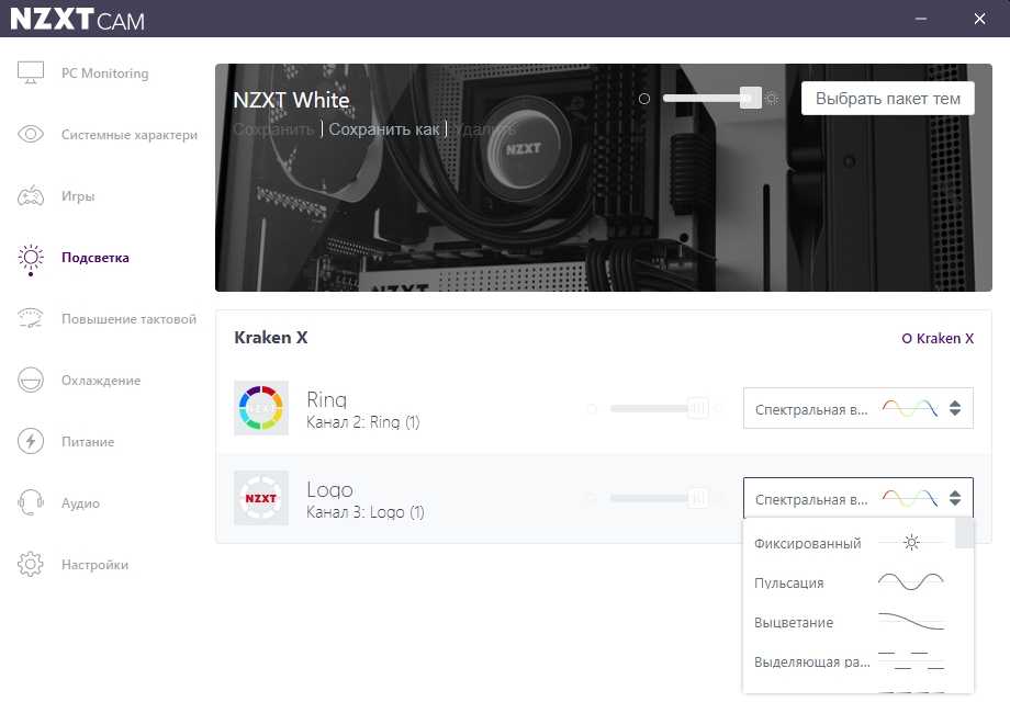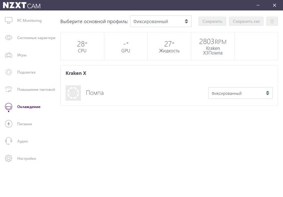 Главная для системы жидкостного охлаждения вкладка «Охлаждение» позволяет управлять оборотами помпы Kraken X53. Здесь можно использовать как профили производителя, так и создать индивидуальный профиль работы помпы.