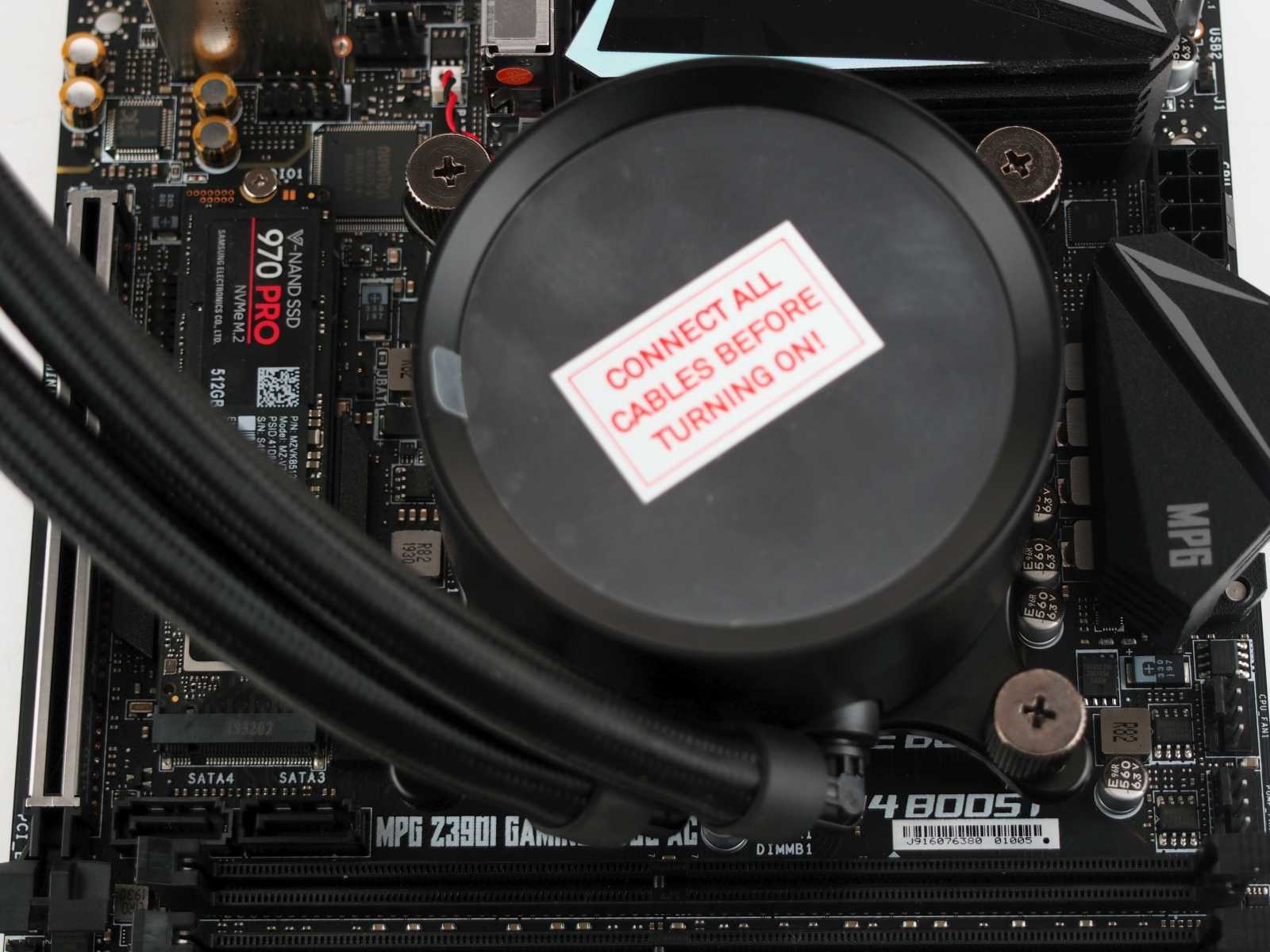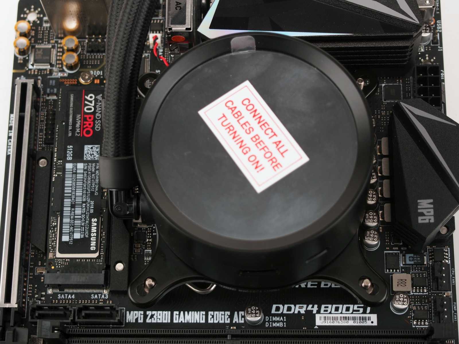 Далее наносим термопасту на крышку процессора и прикладываем водоблок к материнской плате. Здесь стоит отметить преимущество установки Kraken X53 в том, что крепление этой СЖО позволяет установить водоблок устройства так, как удобно пользователю.