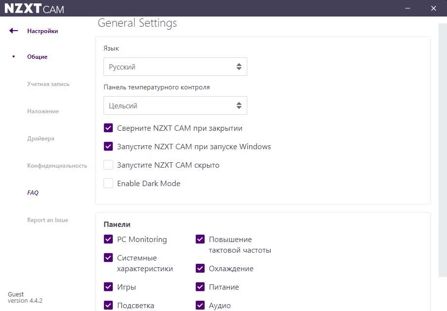 Дополнительные настройки фирменного ПО позволяют использовать NZXT CAM с удобством. Присутствует возможность темного режима, загрузки ПО сразу после старта ОС, а также загрузки в свернутом виде.
