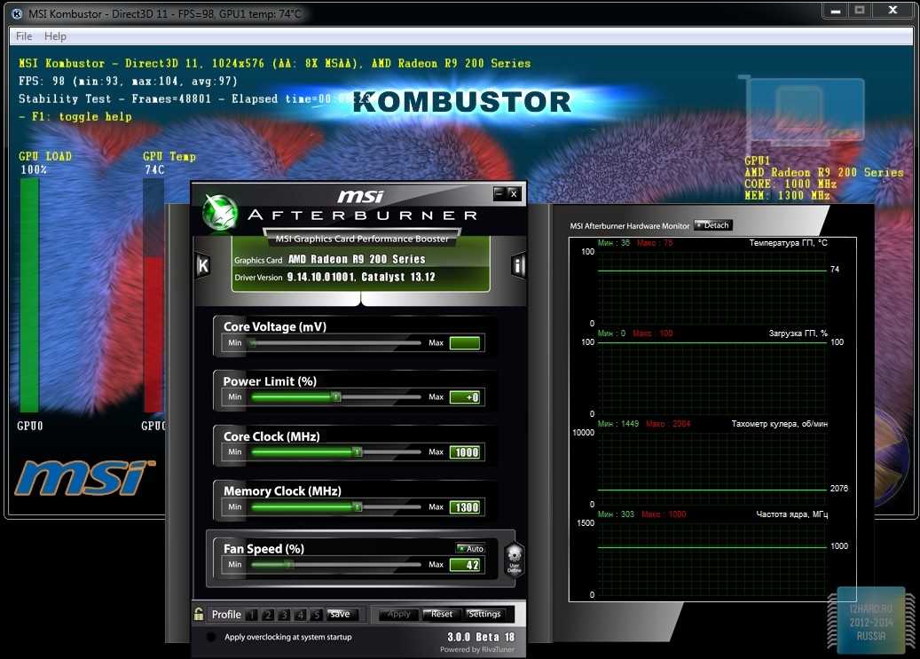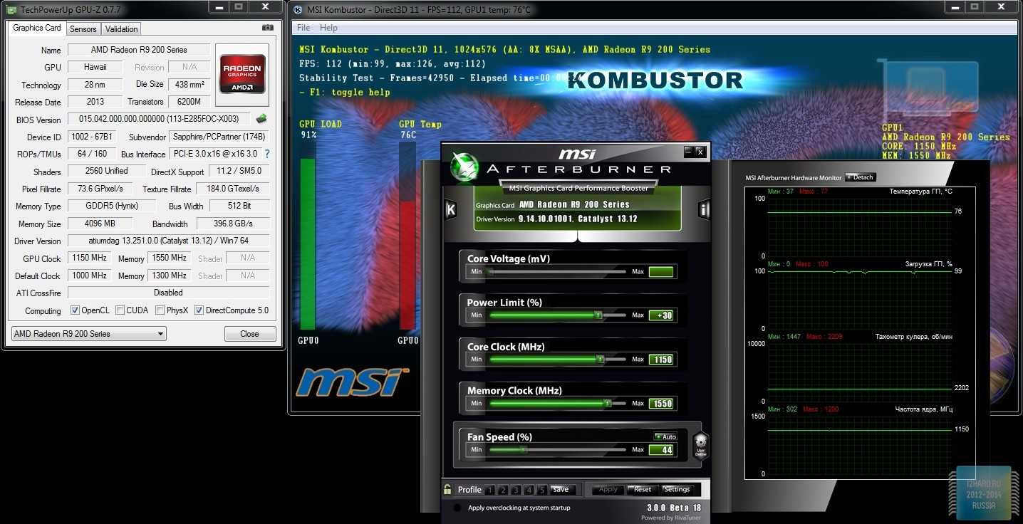 CPU-Z ROG 1.68, GPU-Z 0.7.7, MSI Afterburner 3.0.0 beta 18, MSI Kombustor 2.5, driver Catalyst 13.12 |