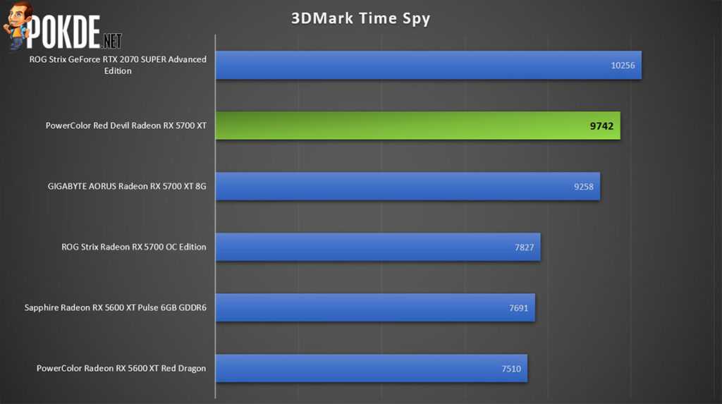 3DMark Time Spy sees the PowerColor Red Devil Radeon RX 5700 XT come much closer to the GeForce RTX 2070 SUPER, and also defeat the GIGABYTE AORUS Radeon RX 5700 XT by a rather significant margin.