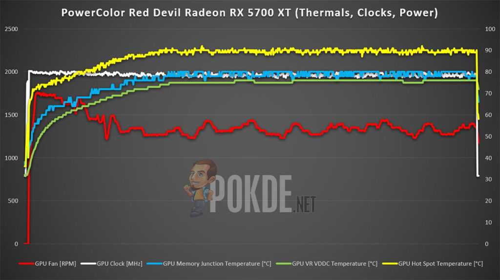 As you might know, AMD GPUs also report the GPU hotspot temperature, which is the hottest point on the GPU. The PowerColor Red Devil Radeon RX 5700 XT here performs really well, with the hotspot remaining below 90°C most of the time, with a few 91°C peaks along the way. The relatively low hotspot temps coupled with the rather high GPU temps indicate that PowerColor’s cooling solution makes excellent, even contact with the GPU die. In any case, AMD considers 110°C to be “within operating specifications”, so it’s nice to see that we have this much thermal headroom available.