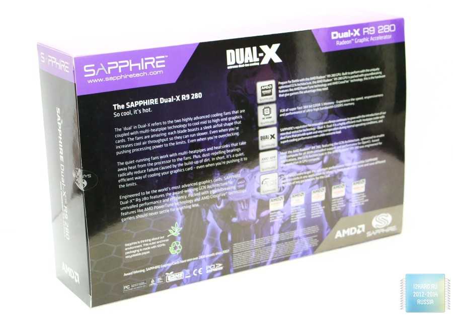 За исключением небольшого разгона GPU видеокарта Sapphire не отличается по спецификациям от эталонной модели Radeon R9 280, которую в таблице выше мы сравнили с видеокартами Radeon R9 280X и Radeon R9 270X. Сравнение с видеокартой Radeon R9 280X провести легко. Обе используют одинаковый GPU, но у «младшей» Radeon R9 280 четыре блока Compute Units из 32 отключены, что даёт 28 CU. Каждый CU состоит из четырёх блоково SIMD по 16 потоковых процессоров, что даёт в сумме 1792 потоковых процессора. Подробности об архитектуре «Graphics Core Next» вы можете прочитать в нашем обзоре Radeon HD 7970. Из-за урезания было уменьшено и число текстурных блоков — их теперь 112. Число конвейеров растровых операций (ROP) AMD оставила на уровне 32. Энергопотребление видеокарты составляет 250 Вт.
