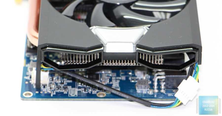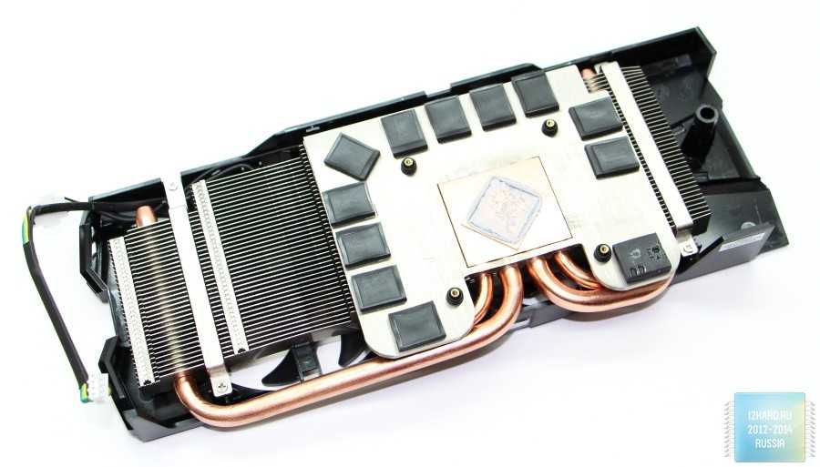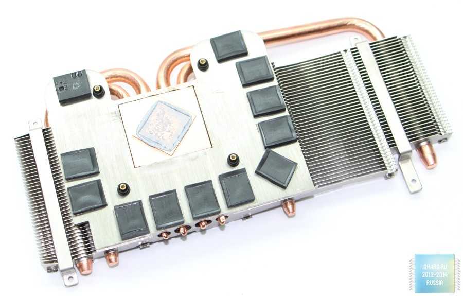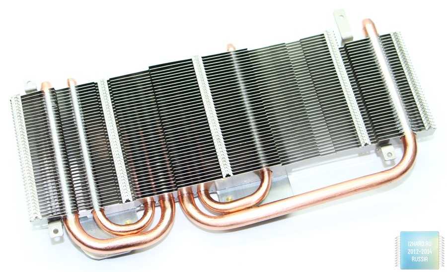 В конструкции радиатора используется достаточно крупный блок алюминиевых пластин и четыре тепловые трубки (две диаметром 6 мм и пара 8 мм), примыкающие к медной пластине, контактирующей с графическим процессором.