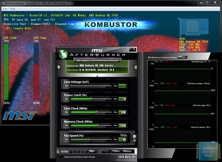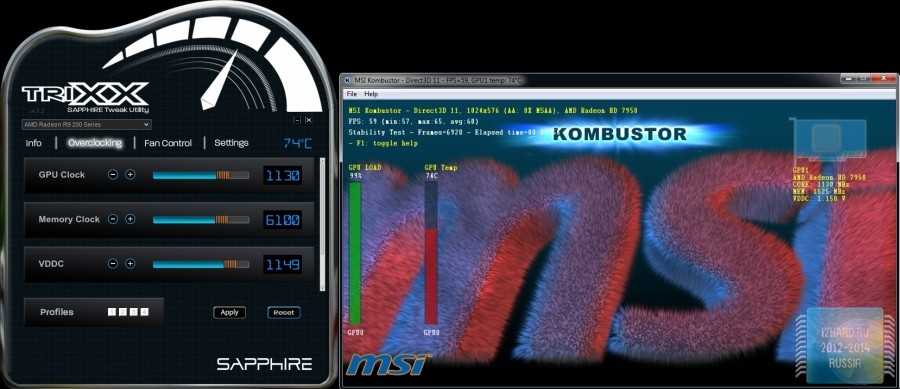 | Прочее ПО | CPU-Z ROG 1.69.2, GPU-Z 0.7.8, MSI Afterburner 3.0.0 beta 19, MSI Kombustor 2.5.1, Sapphire TRIXX 4.8.2, driver Catalyst 14.4 |