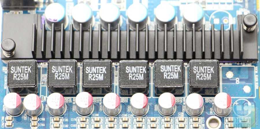 Питание Sapphire Dual-X R9 280 OC выполнено по стандартной 5+1+1 схеме. Используются силовые элементы Suntek c маркировкой R25M. Наиболее горячие элементы питания оснащены алюминиевыми радиаторами.