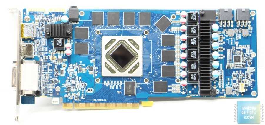 По центру печатной платы в окружении чипов памяти находится графический процессор AMD Tahiti. Видеопроцессор перевернут вверх ногами, а его кристалл развернут на 45 градусов с целью равномерной протяженности токопроводящих дорожек от чипов памяти.