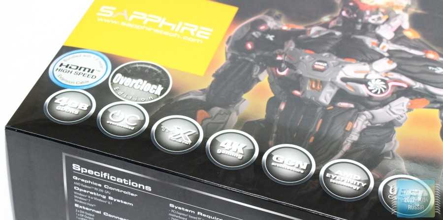 По габаритам и оформлению системы охлаждения карта полностью идентична R9 290X, отличие лишь в том, что маркетологи Saphire решили выделить свое решение среди прочих других с помощью небольшой наклейки.