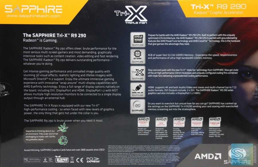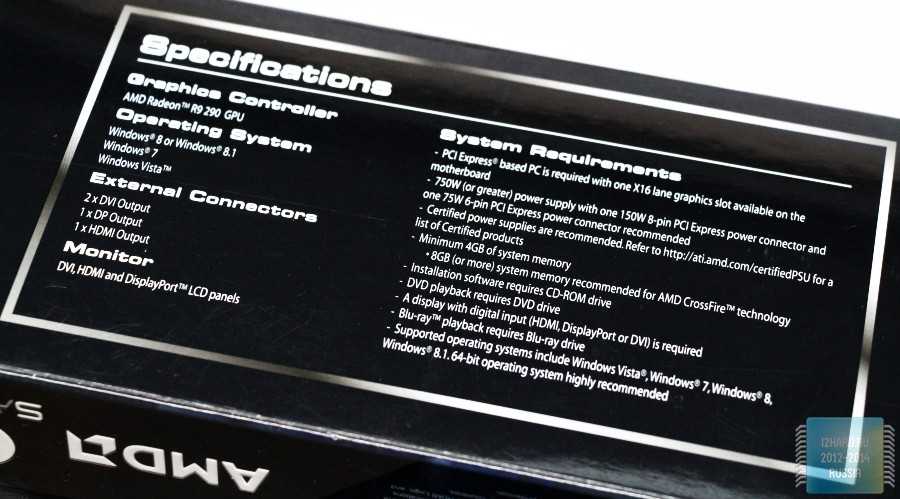 Спецификация девайса находится на торцевой стороне упаковки. Среди прочих требований к Radeon R9 290 в глаза бросается рекомендация использовать блок питания от 750W и выше. На взгляд нашей редакции, в данном случае производитель решил перестраховаться, предпочтя завысить рекомендации по мощности источника питания. Впрочем, наши предположения помогут подтвердить или опровергнуть соответствующие тесты.
