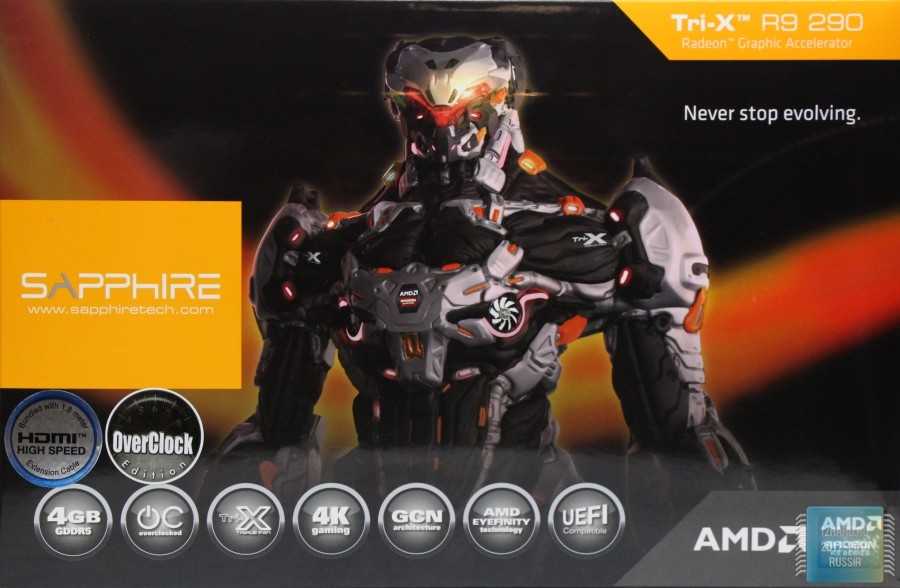 Коробка SapphireTRI-X R9 290 4GB GDDR5 OC своими размерами подстать самому графическому ускорителю, и составляет 375 х 247 х 104 мм (ДхВхШ). На лицевой части упаковки нарисован киборг, взгляд которого обращен прямо на вас. Такая тематика оформления упаковки еще раз подчеркивает принадлежность видеокарты к экстремальному геймингу.