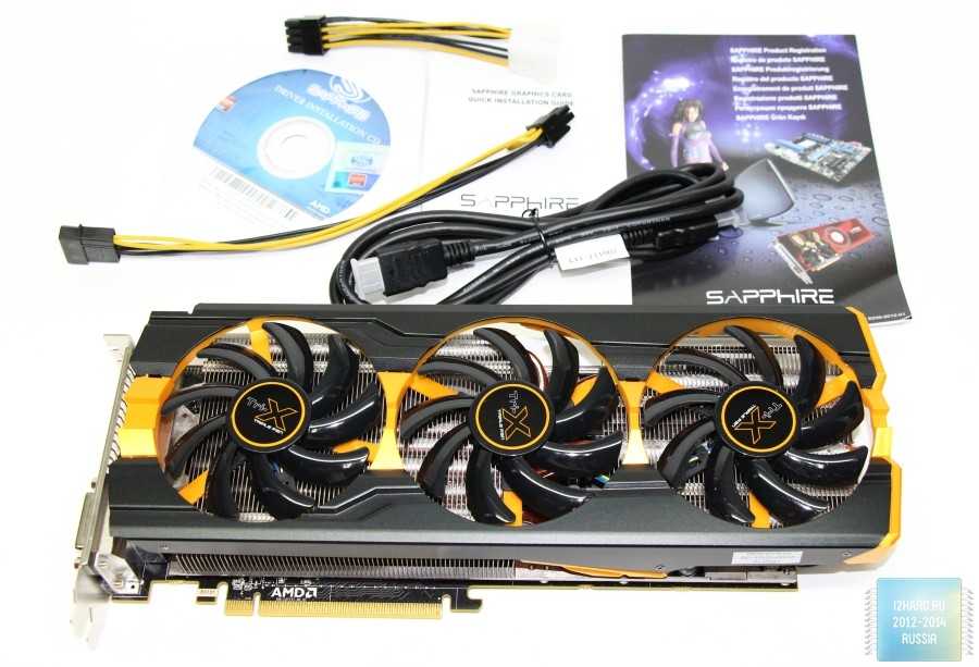Упаковка видеокарты стандартная для компании Saphire, как по ее размерам так и по стилю оформления. Ручка для переноски отсутствует, а вот перечисление используемых технологий на месте. Комплект поставки, как и коробка, продолжает соблюдать традиции Saphire: кроме инструкций в нем имеется кабель HDMI и пара переходников питания.