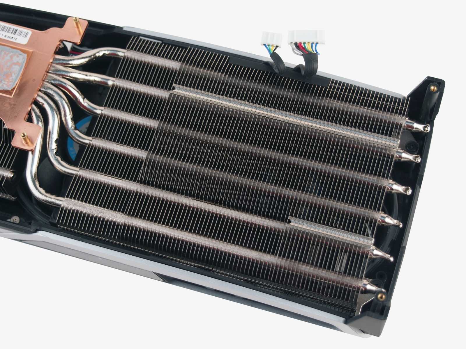 Графическая карта использует сочетание воды и воздуха, чтобы снизить ее температуру. Это позволяет ей разгоняться больше, увеличивая производительность.