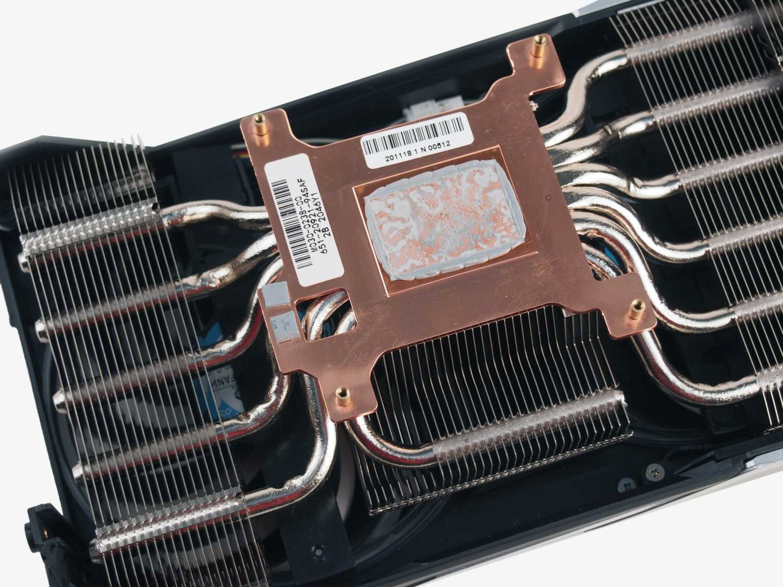 Для отвода тепла от графического процессора в конструкции СО используется медная пластина, с обратной стороны которой находится небольшая секция с алюминиевыми пластинами и тепловыми трубками. Непосредственно сами трубки распределены на системе охлаждения Nitro+ Radeon RX 6800 XT Gaming следующим образом: пять окончаний тепловых трубок отводят тепло на небольшую секцию радиатора в левой части, а еще одна тепловая трубка «остается» на основной секции радиатора СО. С правой стороны все шесть тепловых трубок равномерно распределены по третьей и самой массивной секции алюминиевых пластин.