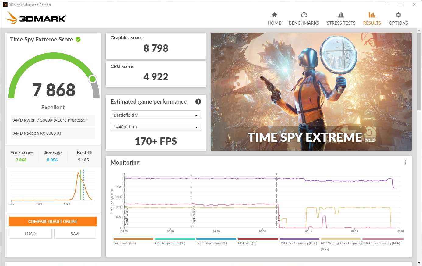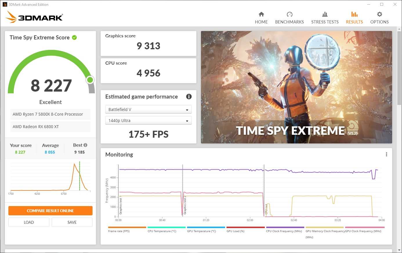 Более серьезное испытание в виде TimeSpy Extreme позволили набрать видеокарте 8798 и 9313 баллов соответственно.