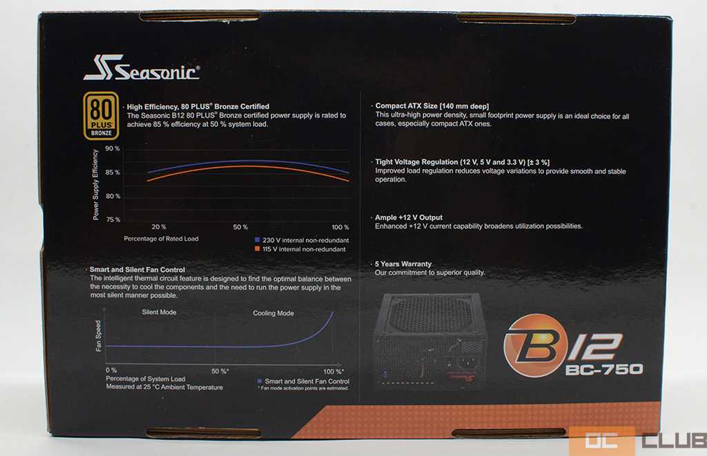 Seasonic B12 750 Вт и 850 Вт поставляются в среднегабаритной коробке. Сочетание чёрного с бронзовым намекает на соответствующий сертификат энергоэффективности, ну а прямо об этом говорит логотип 80 PLUS Bronze.