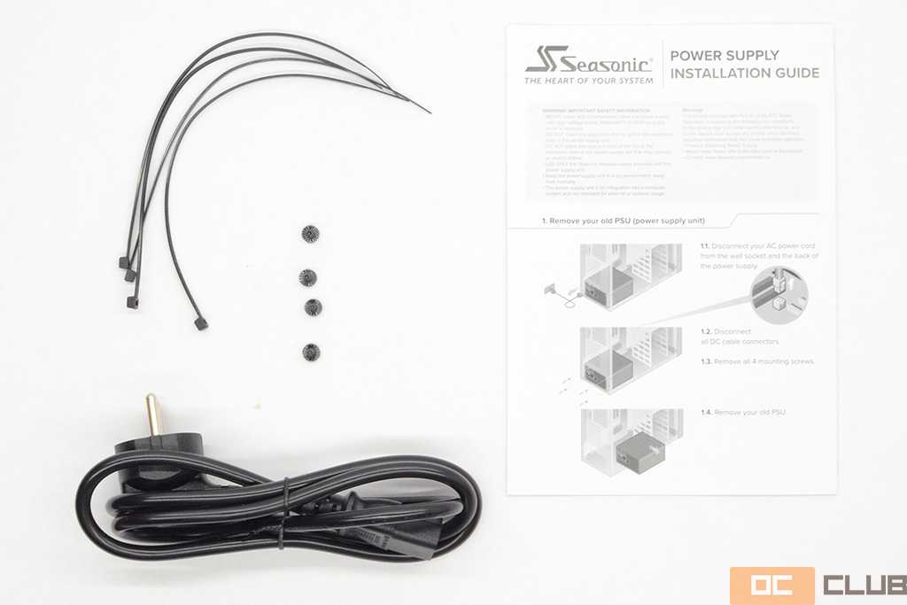 На тыльной стороне приведены ключевые особенности, кривые КПД в зависимости от потребляемой мощности в сетях ~110 В и ~220 В, а также график зависимости скорости вращения пропеллера от мощности. Seasonic обещает неизменные обороты вплоть до ~70% нагрузи от номинала, хотя на официальной странице график совсем другой. Спойлер: действительность не отображает ни один, ни второй, что покажет дальнейшее тестирование.