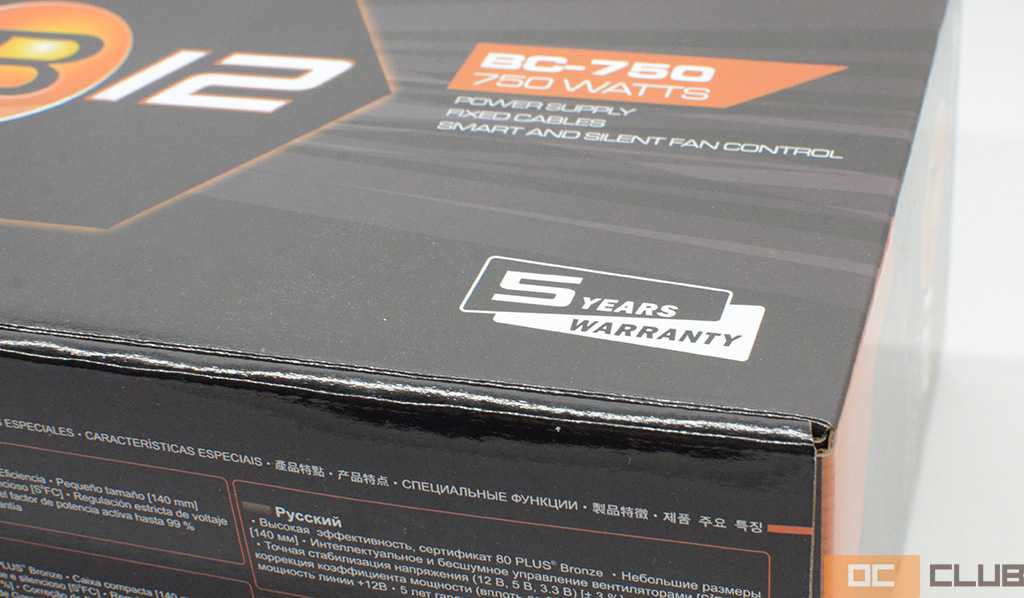 На торце коробки электрические параметры, количество разъёмов и кабелей, а также их длины. При первом взгляде всё неплохо, но удивляет отсутствие защит OTP и UVP (от перегрева и пониженного входящего напряжения). Как отмечалось в обзоре «золотой» линейки Seasonic G12, это не страшно, поскольку UVP-защита дублируется материнской платой и в целом низкое напряжение безопасно для оборудования, а OTP нужна лишь если вентилятор совсем колом станет.