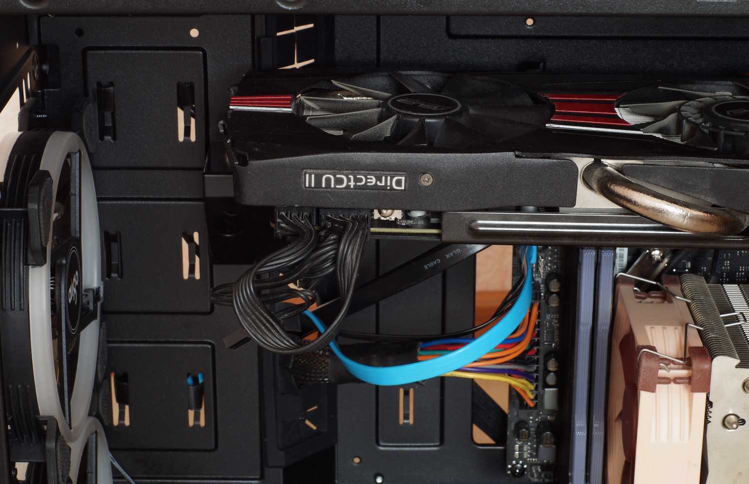 И следом видеокарта, печатная плата которой как раз «легла» на пластиковый кронштейн корпуса, чтобы избежать прогиба.