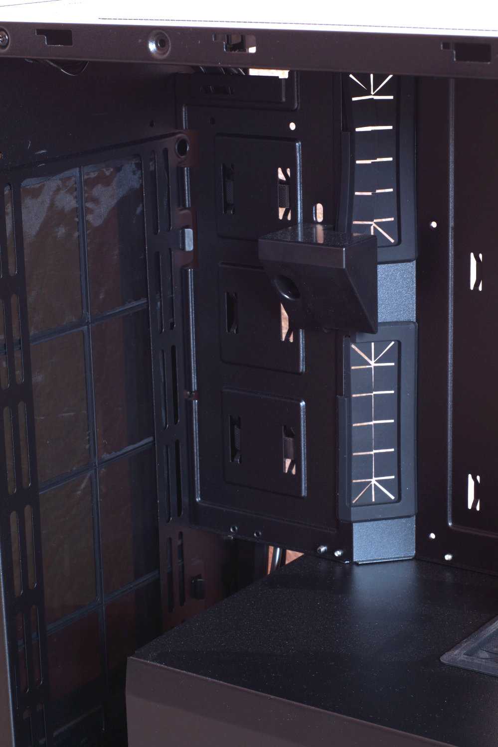 Что бросается в глаза – это отсутствие предустановленных вентиляторов, но места под установку имеются. Один 120 мм вентилятор может быть установлен на задней стенке. Отметим должное: на задней стенке имеется 5заглушек слотов, а значит, в случае необходимостиможно будет установить двухслотовую видеокарту даже в самый нижний слот материнской платы. Другая деталь, подчеркивающая продуманность конструкции и премиум-уровень – наличие в передней части пластикового упора для длинной видеокарты, чтобы избежать прогиба печатной платы.