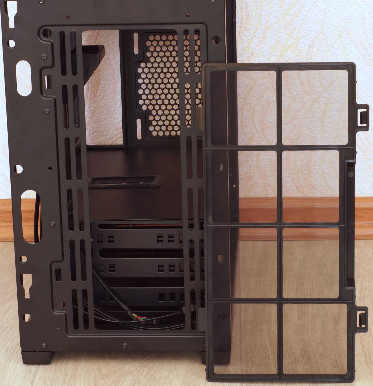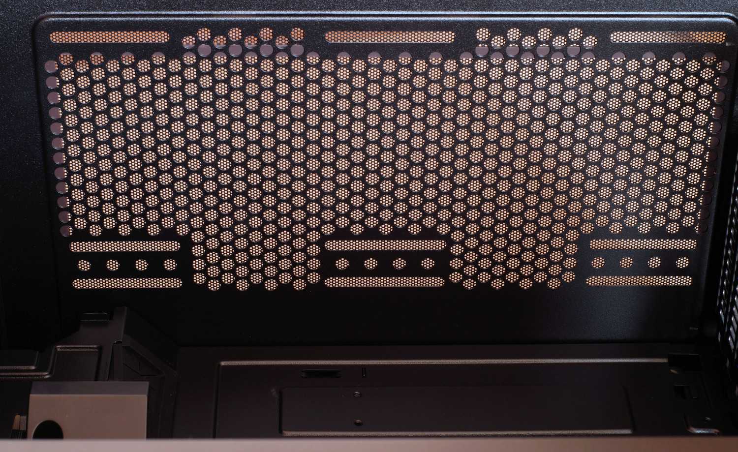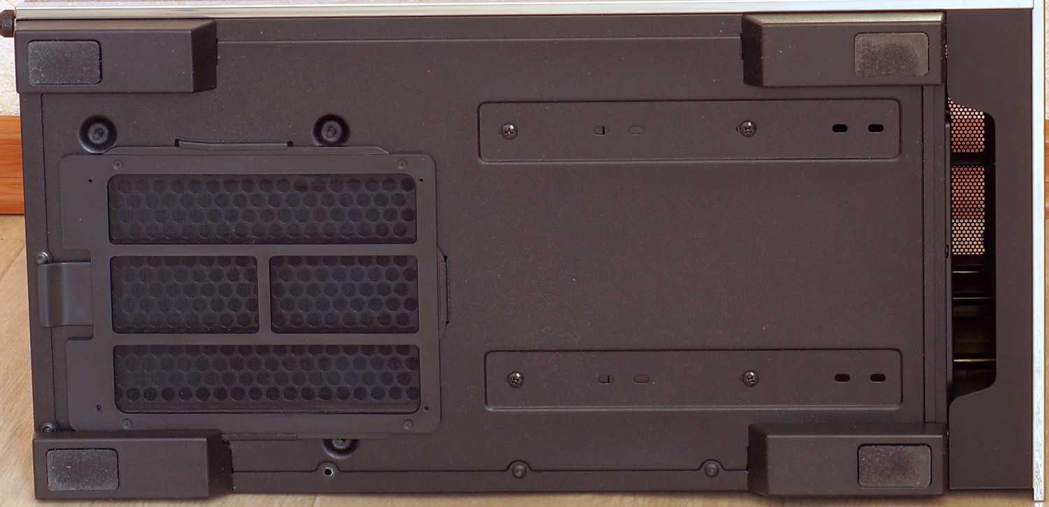Дно корпуса также содержит перфорацию в области размещения блока питания с противопылевым фильтром. Частичный приток воздуха спереди будет обеспечиваться через широкое отверстие, которое является «ручкой» для снятия лицевой панели.