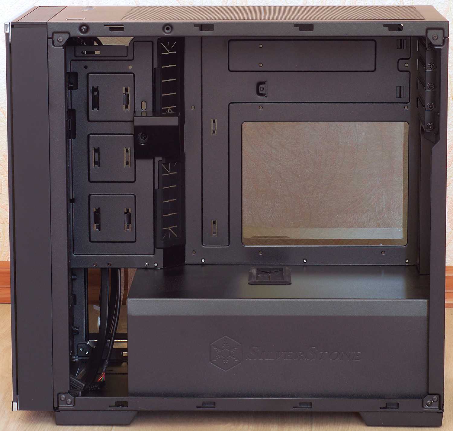 Из особенностей корпуса, связанных с размерами – есть ограничение на максимальную глубину блока питания 160 мм при использовании корзины под накопители в штатном положении; если ее снять или передвинуть, то ограничение вырастает до 220 мм.