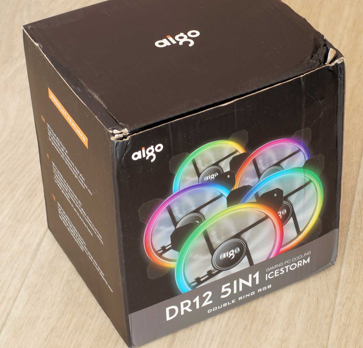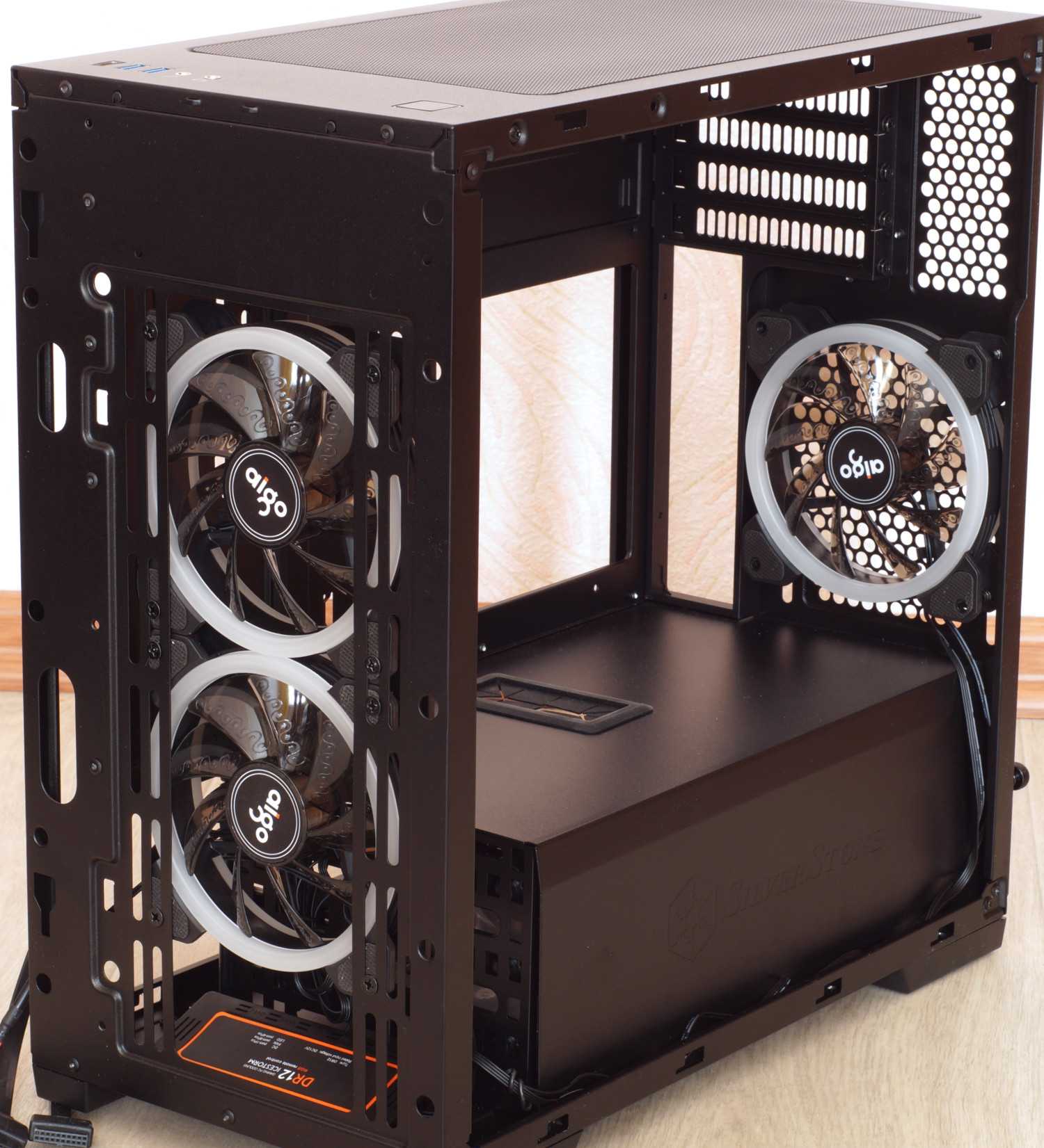 При сборке в первую очередь стоит определиться с количеством устанавливаемых вентиляторов. Предпочтительно, чтобы они были с подсветкой, иначе теряется эффектный внешний вид от трех стеклянных стенок. Мы использовали 3 x 120 мм вентилятора Aigo DR12 (1200 rpm) из серии Ice Storm, имеющие RGB-подсветку с двойным кольцом.