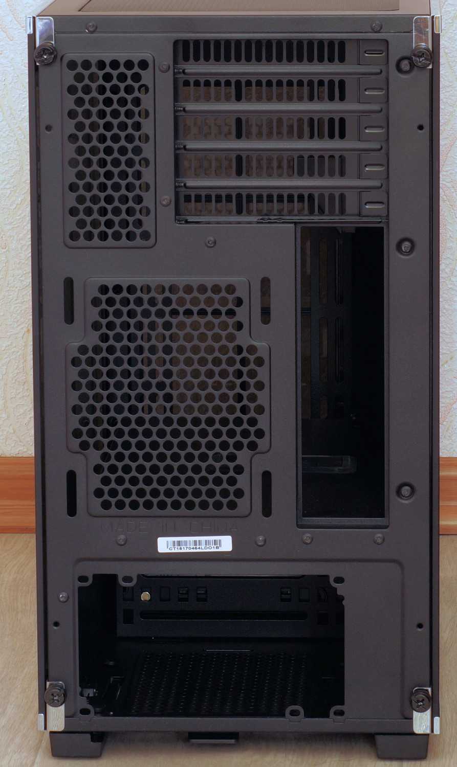 Как уже отмечали, лицевая сторона выполнена полностью из тонированного закаленного стека, делая из него хорошее зеркало. Отсутствие вентиляции спереди позволяет надеяться, что корпус будет тихим (при использовании соответствующих вентиляторов), а с другой стороны, возникают некоторые опасения на счет эффективности охлаждения. Особая конструкция корпуса хорошо заметна по задней стенке, когда материнская плата размещается на левой боковой стенке (относительно лицевой панели). Задняя часть получила максимальную область перфорации и, учитывая ширину корпуса (218 мм), сзади можно установить только один 120 мм вентилятор.