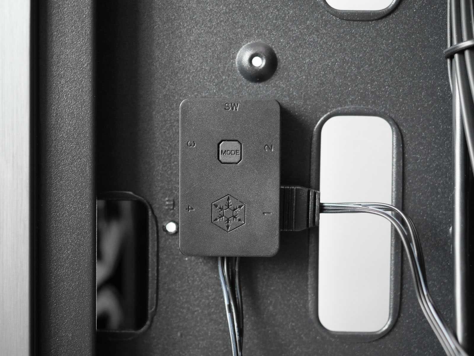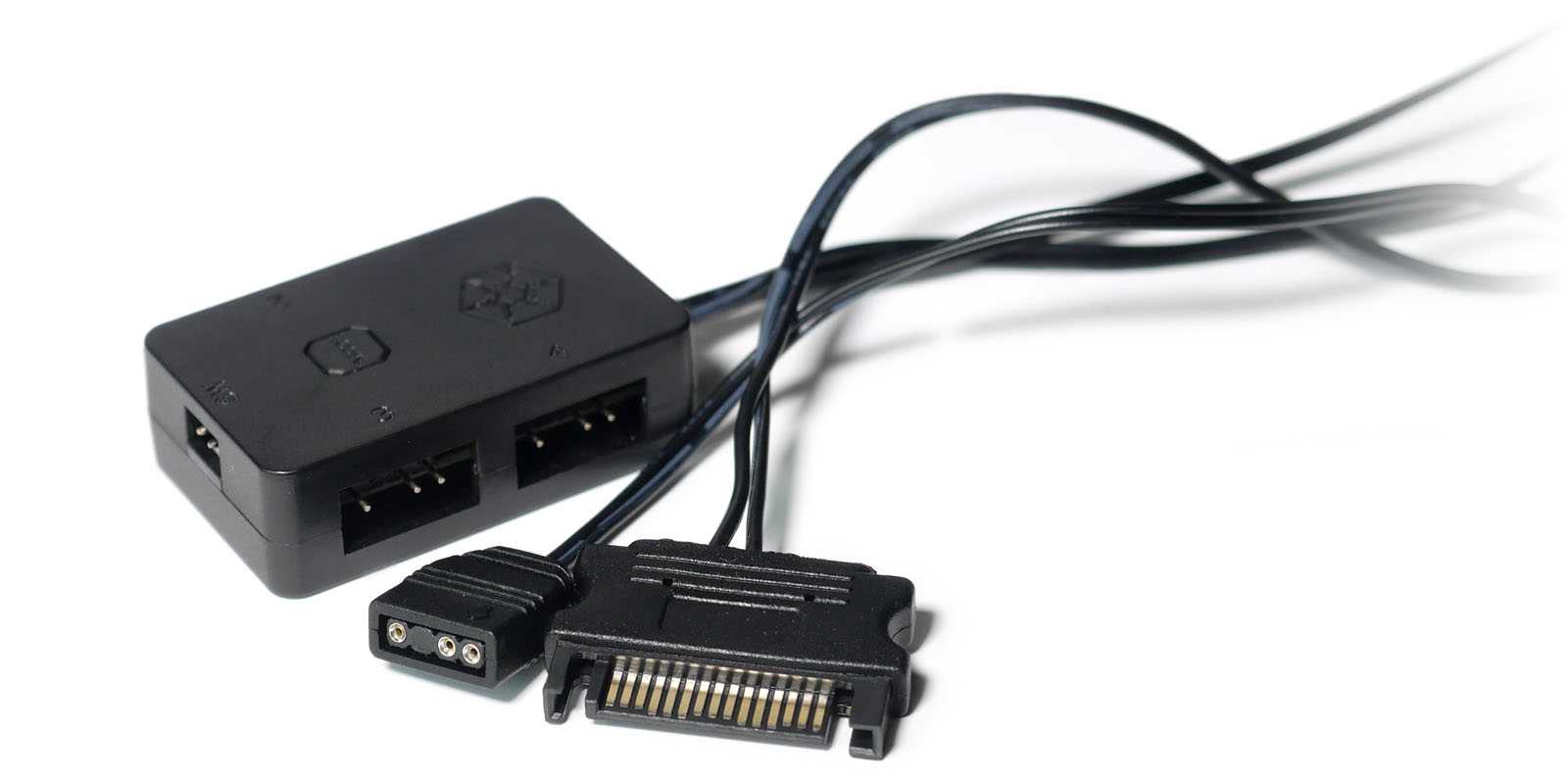 В комплекте также идёт отдельный компактный (44 x 28 x 14 мм) контроллер для автономной работы подсветки с питанием от SATA-разъёма. В него заложено несколько эффектов бегущих огней, пульсации, мигания и статичного свечения, переключаемых кнопкой. Возможно подключить до четырёх ARGB-устройств без учёта разветвителей. На самом контроллере есть двухконтактный разъём для подключения дистанционной кнопки. Примечательно, что к нему подходит штекер от кнопки перезагрузки на верхней панели корпуса. Таким образом можно вместо перезагрузки ПК использовать фронтальную кнопку Reset для смены ARGB-эффекта подсветки.