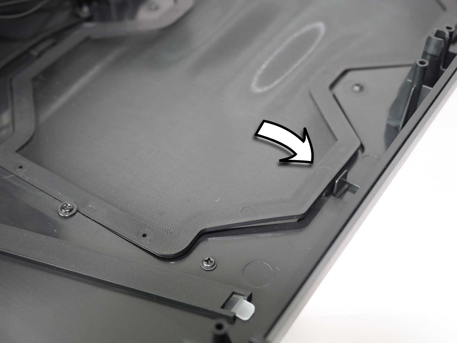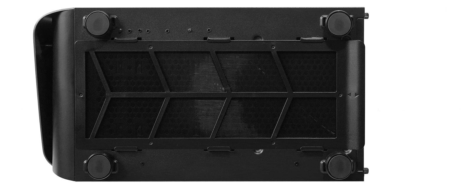 Нижняя часть корпуса оснащена длинным (372 мм) съёмным пылевым фильтром. Извлечение с креплений осуществляется сдвигом назад, что не очень удобно, так как требует наличие свободного пространства позади системного блока. Возможно развернуть его и в дальнейшем извлекать вперед.