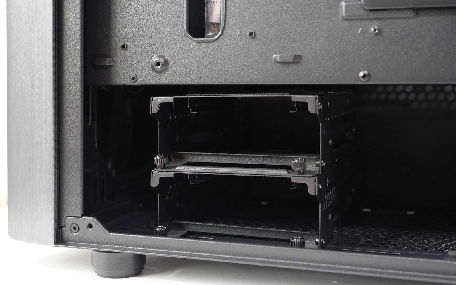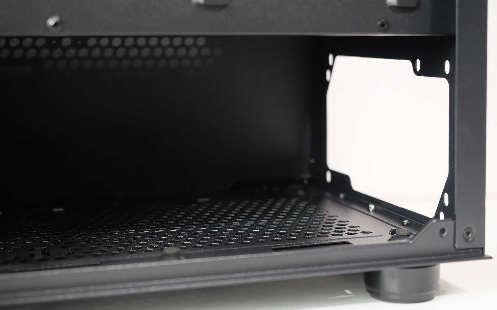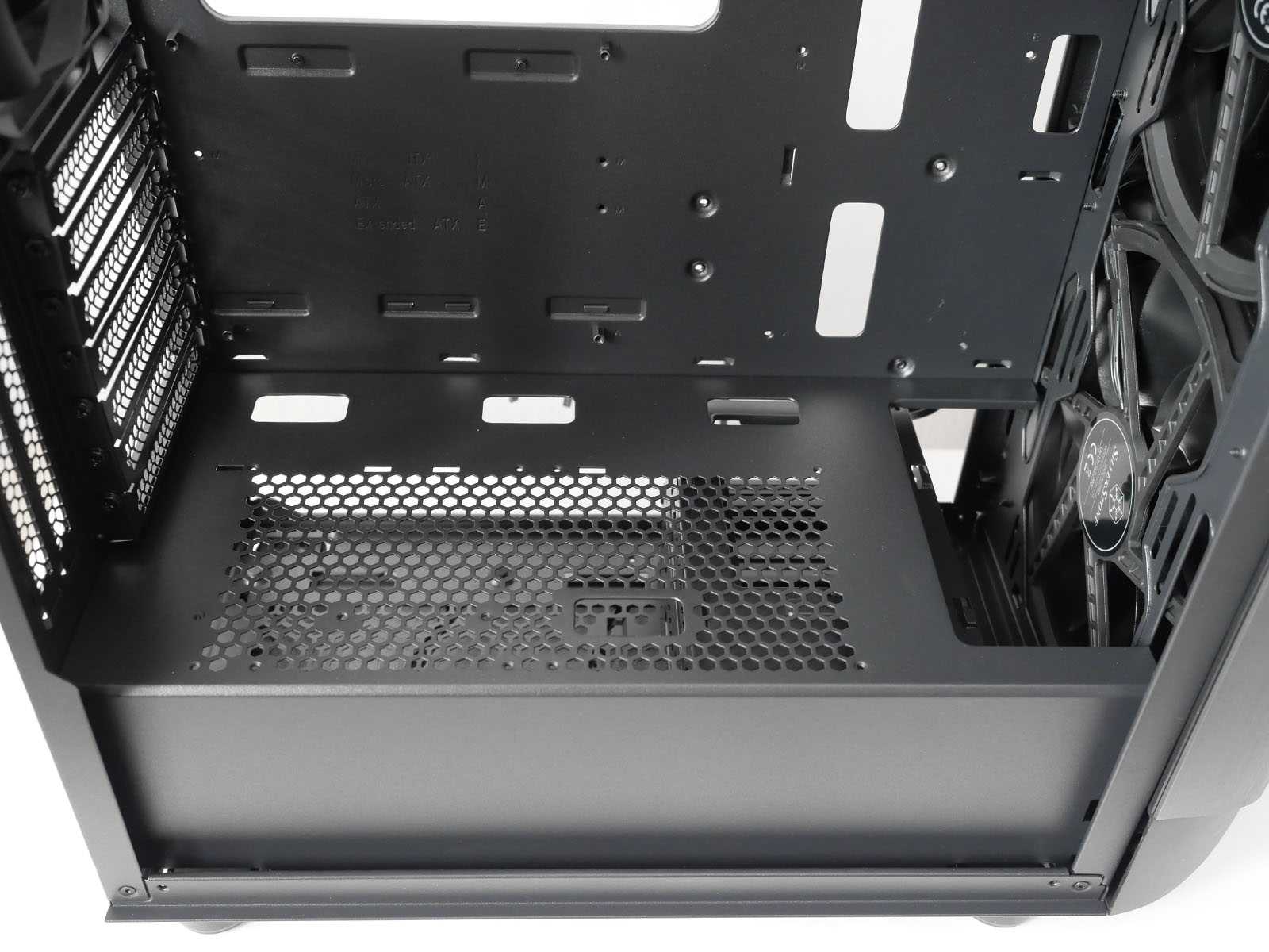 Нижняя часть отделена несъёмной перегородкой, в которой предусмотрены не только вентиляционные отверстия (которые пригодятся в случае с пассивными блоками питания), но и специальные вырезы для удобного подведения проводов питания видеокарты, а также установки длинных радиаторов СЖО за фронтальной панелью. Глубина последнего — 60 мм.