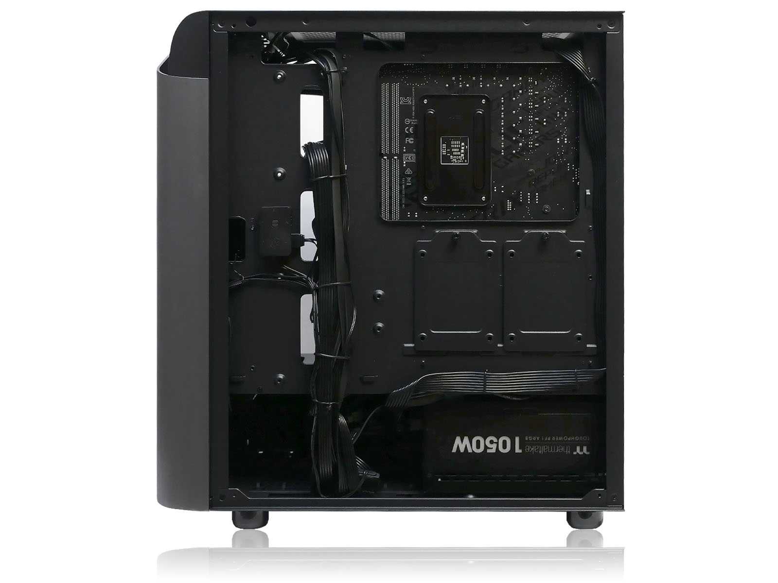 В поддоне материнской платы подготовлен крупный вырез 184 (Ш) на 143 мм (В) для доступа к бэкплейту системы охлаждения без снятия самой платы. Прорези для кабель-менеджмента скруглены, хорошо обработаны и имеют достаточные размеры, чтобы протянуть коннекторы проводов от блока питания к устройствам. В различных местах предусмотрены специальные ушки для хомутов и аккуратной фиксации кабелей. Между задней стенкой каркаса и съёмной металлической панелью остаётся запас около 1,5 см, которого хватит в большинстве сборок как для плоских кабелей БП, так и для собранных в пучок.