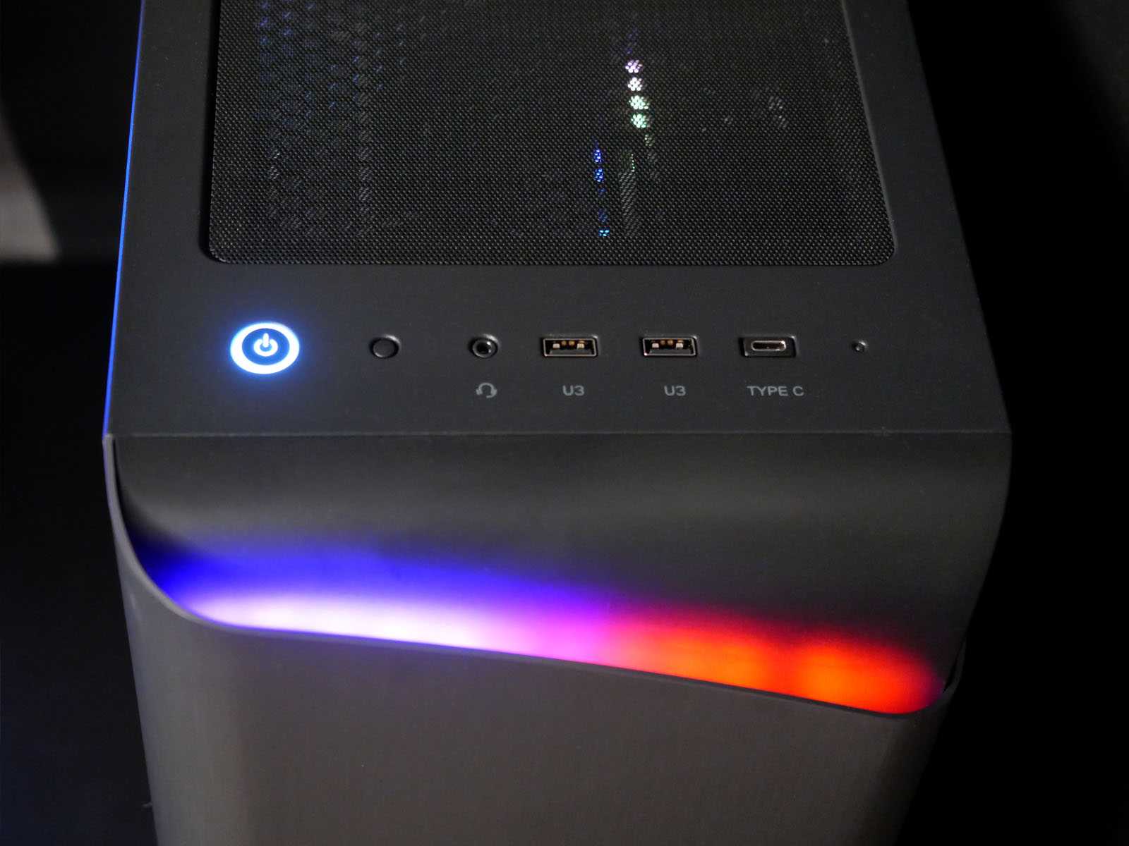 Набор портов кроме комбинированного аудиогнезда 3,5 мм и двух USB 3.0 включает один USB Type-C разъём, ставший востребованным в последнее время. Кнопка включения и выключения ПК имеет кольцевую подсветку белого цвета.