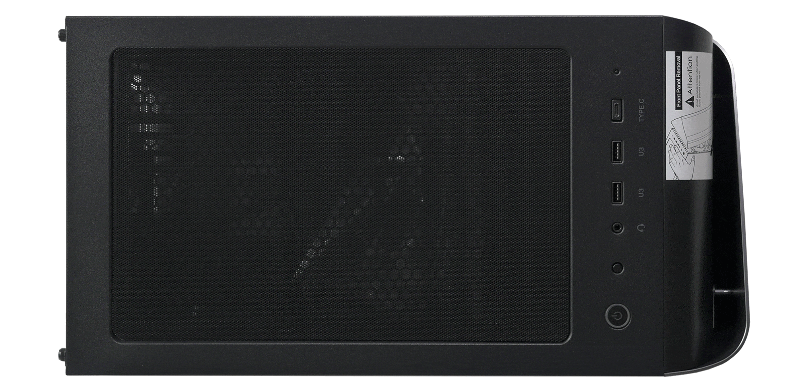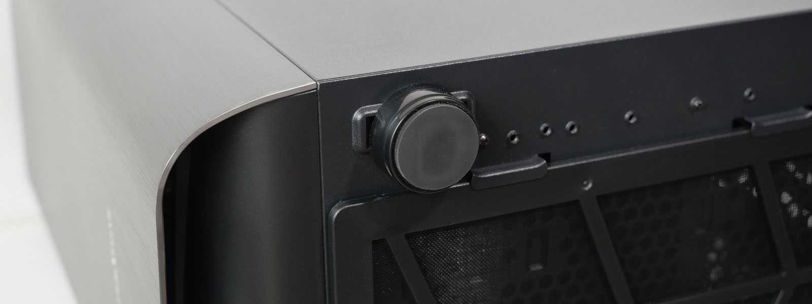 На верхней части сделана крупная перфорированная зона для систем охлаждения, закрытая удобным быстросъёмным пылевым фильтром размером 285 x 182 мм на магнитном креплении. Фронтальные разъёмы также перенесены наверх, что по задумке должно было обеспечить удобство обслуживания фронтальных вентиляторов, так как снятию передней панели не мешали бы провода от них. Однако модули подсветки остались размещены спереди и их провод не позволит далеко отодвинуть снятую панель от основного шасси.