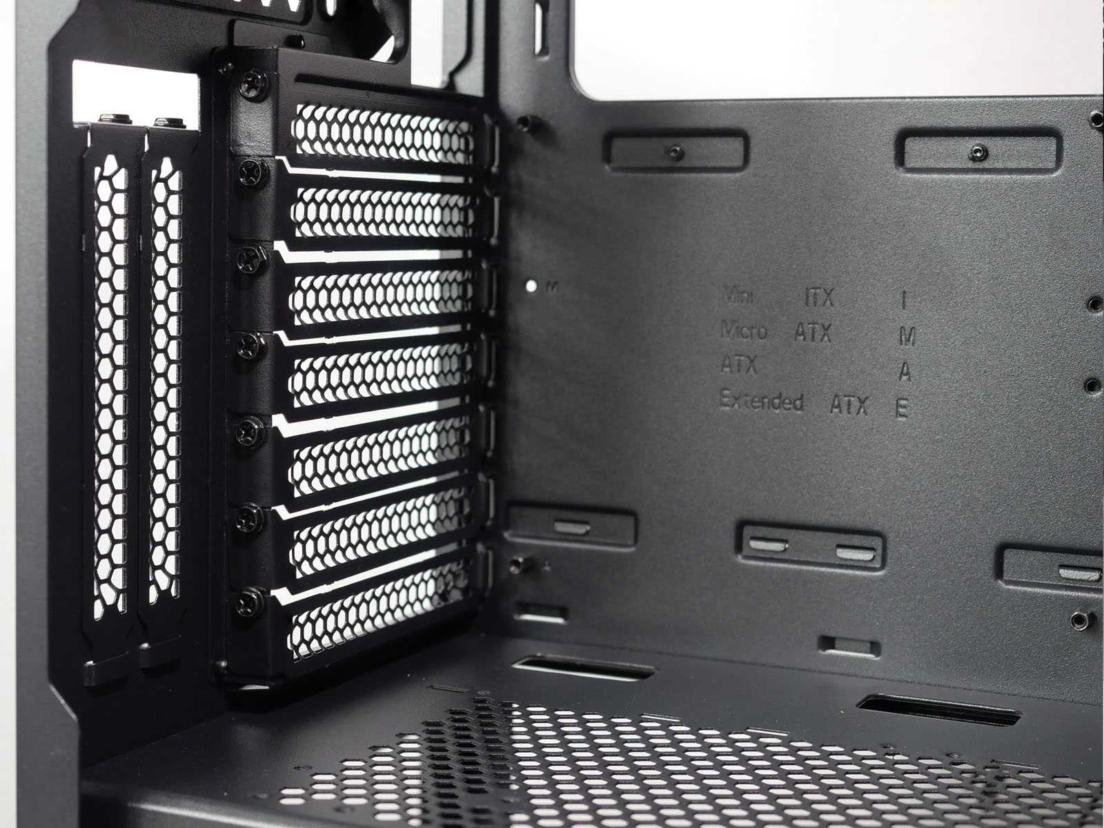 Поддон материнской платы рассчитан на установку Mini-ITX, MicroATX, ATX и EATX-модификаций. Отверстия намечены точно и промаркированы. В некоторых из них уже установлены нужные металлические подставки, дополнительные имеются в комплектном наборе крепежа. Вложена и специальная насадка для их удобного вкручивания. Все слоты расширения оснащены многоразовыми съёмными металлическими заглушками.