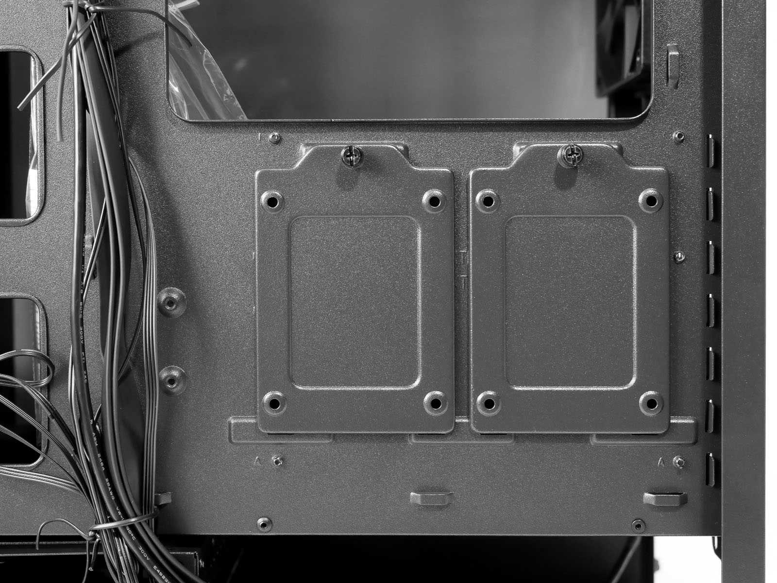 Также хотелось бы отметить, что у корпуса есть не задокументированные возможности. Извернувшись, можно установить не пару HDD на боковую панель, а все три. Если блок питания с модульными кабелями плоского типа, то влезет не 150 мм глубиной, а 160 мм. Пользователи с прокачанным навыком обращения с двухсторонним скотчем найдут ещё немало мест, где можно установить 2,5-дюймовый накопитель, если, конечно, «родных» трёх посадочных мест будет недостаточно.