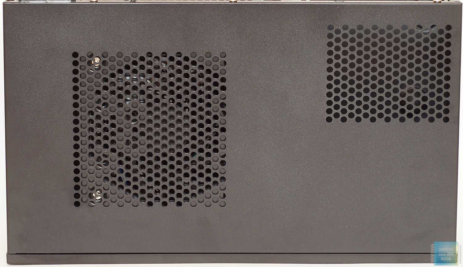 Сверху предусмотрено две области свентиляцией: одна большая для доступа воздуха в область материнской платы/процессорного кулера/платы расширения, а другая – для вентилятора блока питания.
