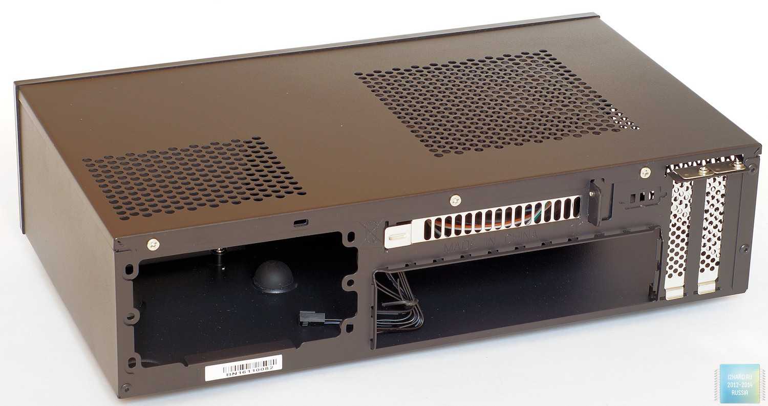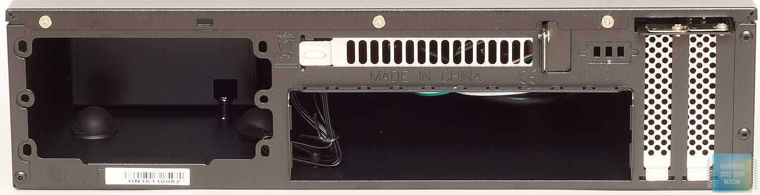 По задней стенке можно определить компоновку SilverStone ML09 и она отличается отSilverStone ML06: слева размещается блок питания, справа находятся два отсека для низкопрофильных плат расширения (ширина 2.95″/74.93 мм). Есть место под установку однослотовой платы расширения (например портов USB/FireWire/COM).