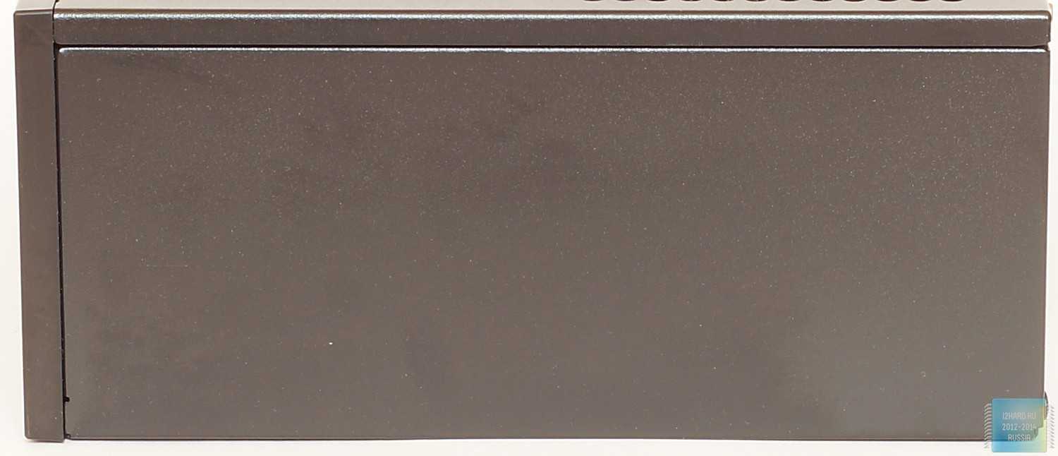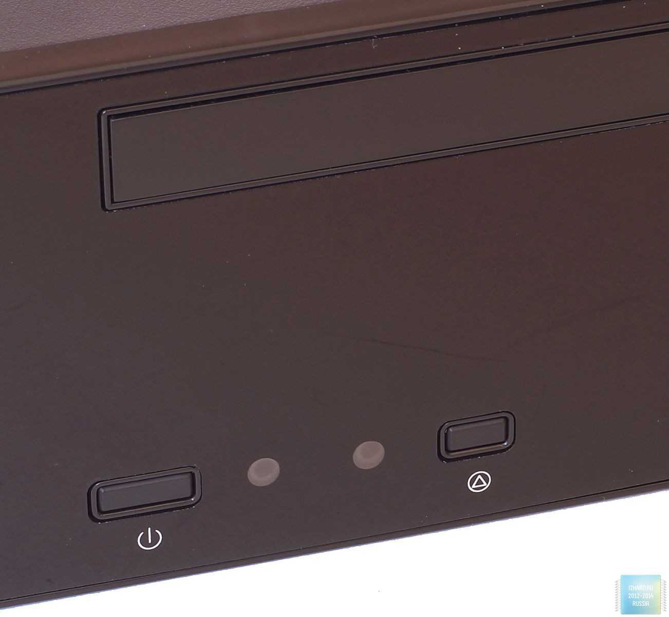 Декоративных элементов передняя панель не содержит, тут все строго, только сама панель с зеркальной полировкой, на которой имеется заглушка для тонкого5.25″ оптического привода и органы управления/индикации. Высота без учета ножек равна 99 мм, а ширина 350 мм.